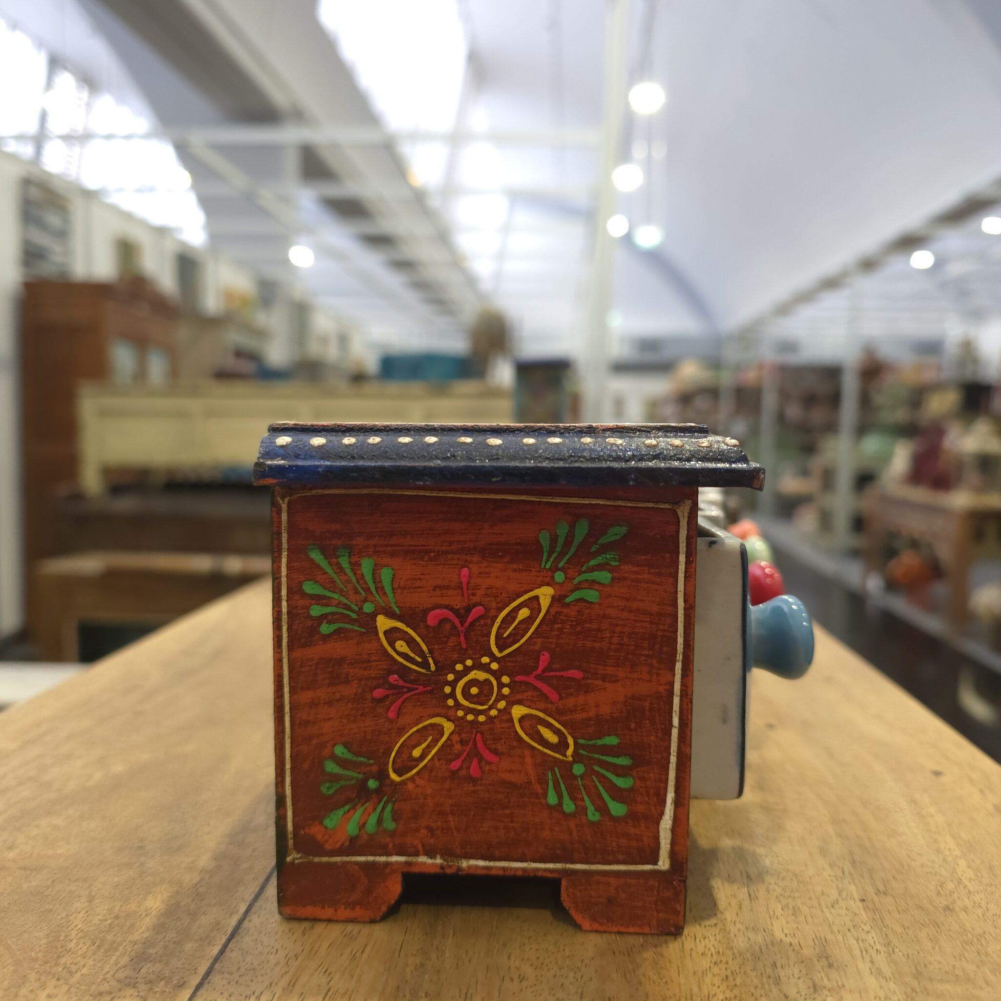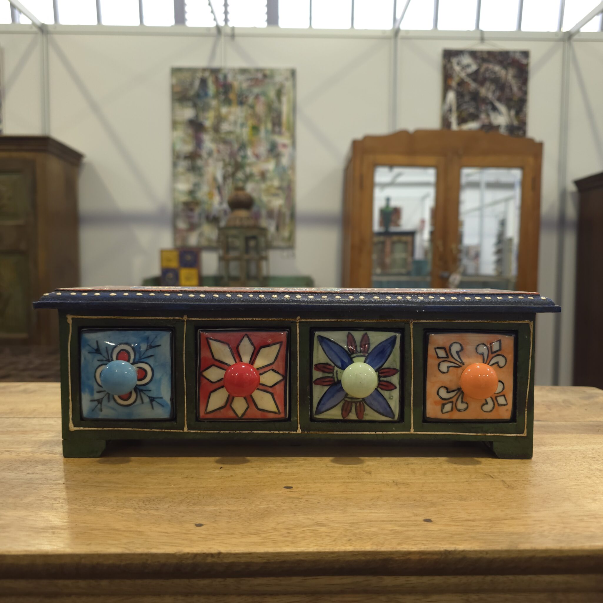 Das Herzstück der 4 Fach Keramikbox bilden die vier kleinen Schübe aus Keramik. Diese wurden mit feinen Pinseln liebevoll von Hand bemalt. Deshalb weist jede Lade ein individuelles Muster auf, das Geschichten aus fernen Ländern erzählt. Die glänzende Oberfläche der Keramik harmoniert wunderbar mit dem matten Holzgehäuse. Somit entsteht ein optisches Highlight für jedes Regal oder jeden Tisch. Zudem lassen sich die Laden einfach herausziehen und befüllen. Die 4 Fach Keramikbox ist folglich nicht nur dekorativ, sondern auch äußerst praktisch im Alltag.