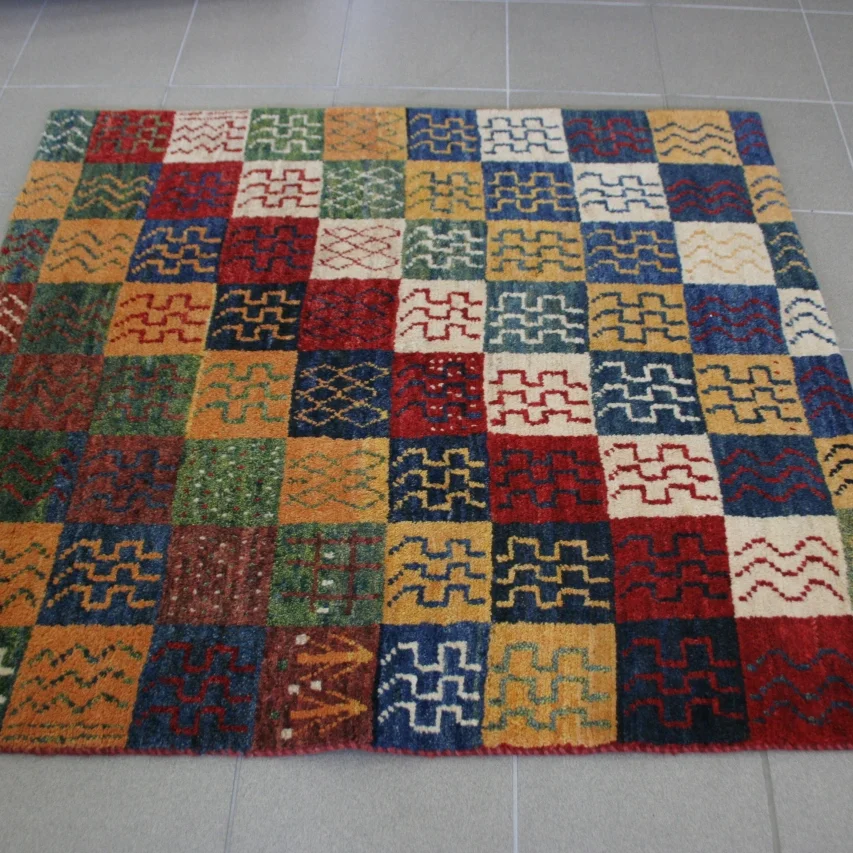 Handgeknüpft aus robuster Wolle, entfaltet dieser Teppich ein farbenfrohes Mosaik aus geometrischen Mustern – jede Kachel trägt ihr eigenes Motiv, von stilisierten Wellen bis zu verschlungenen Kreuzen. Die kräftigen Blau-, Rot-, Gelb- und Grüntöne setzen lebendige Akzente, während die dichte Knüpfung für Langlebigkeit sorgt. In Flur oder Wohnbereich bringt er Bewegung in den Raum, ohne dabei unruhig zu wirken.