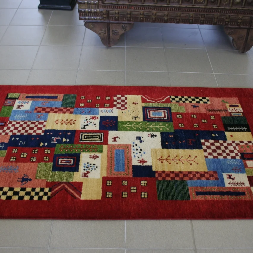 Handgeknüpft aus reiner Wolle, erzählt dieser Teppich von der Vielfalt indischer Ornamentik. Jedes der geometrischen Felder trägt ein eigenes Motiv — mal ein Schachbrettmuster, mal stilisierte Tiere, dann wieder zarte Pflanzenranken oder traditionelle Medaillons. Die kräftigen Rot-, Blau-, Grün- und Gelbtöne harmonieren durch den breiten roten Rahmen zu einem lebendigen Ganzen. In deinem Flur oder Wohnbereich bringt er Farbe und eine spielerische, beinahe erzählerische Note in den Raum.