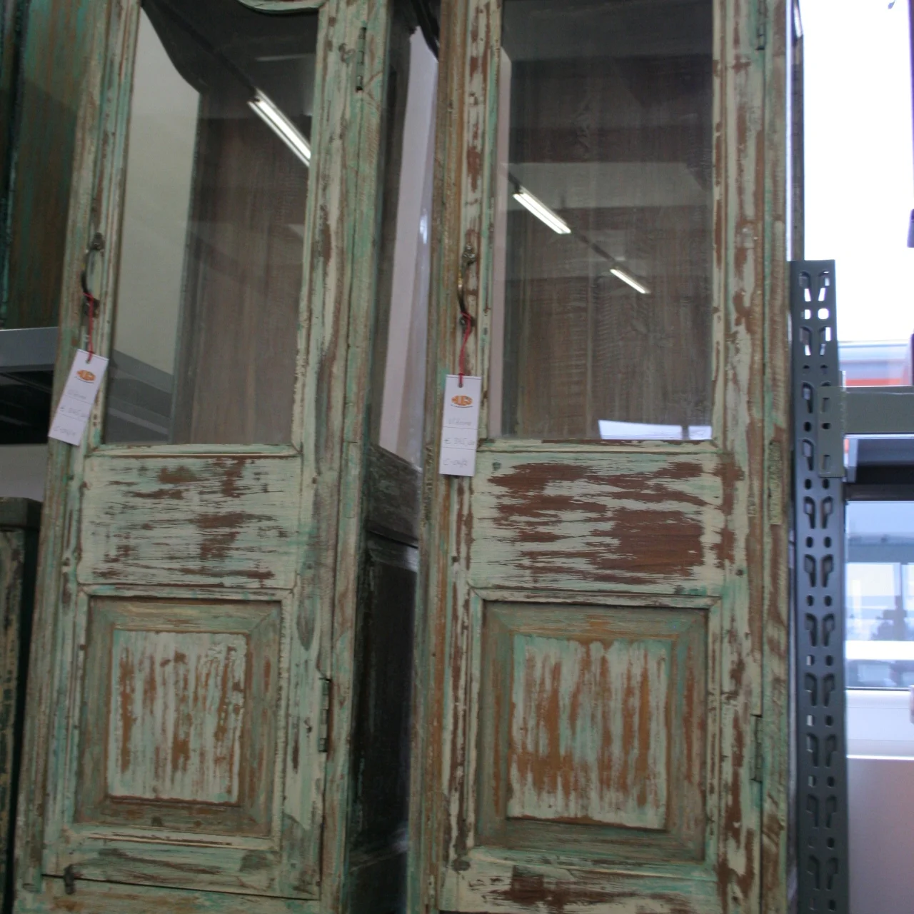 Altholz in verwittertem Türkis und erdigen Rottönen prägt den Charakter dieses schmalen Vitrinenkästchens. Die Kassettentüren mit gerahmten Glasfenstern zeigen die Spuren jahrzehntelanger Nutzung — abgeblätterte Farbe, natürliche Patina, leichte Risse im Holz. Jede Unebenheit erzählt von der Zeit, die Metallbeschläge sitzen fest und funktional. Mit seiner kompakten Höhe passt es als Regal für Geschirr, Sammeltassen oder Bücher in Flur und Wohnzimmer.