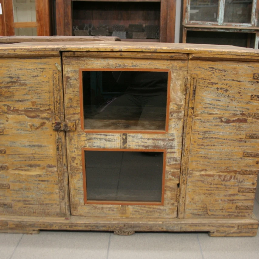 Die abgeblätterte Farbe erzählt vom langen Leben dieser Kommode — gelbe Pigmente setzen sich über hellere Schichten, das Holz schimmert an den Kanten durch. Zwei mittige Glaseinsätze geben den Blick auf Verwahrtes frei, während die seitlichen Türen mit schmalen Metallriegeln gesichert werden. Die Oberfläche trägt Kratzer, Abrieb und jene Unregelmäßigkeiten, die nur Jahrzehnte im Alltag hinterlassen. Ein Möbel mit Vergangenheit, das in modernen Räumen als Sideboard oder Lowboard Spannung erzeugt.