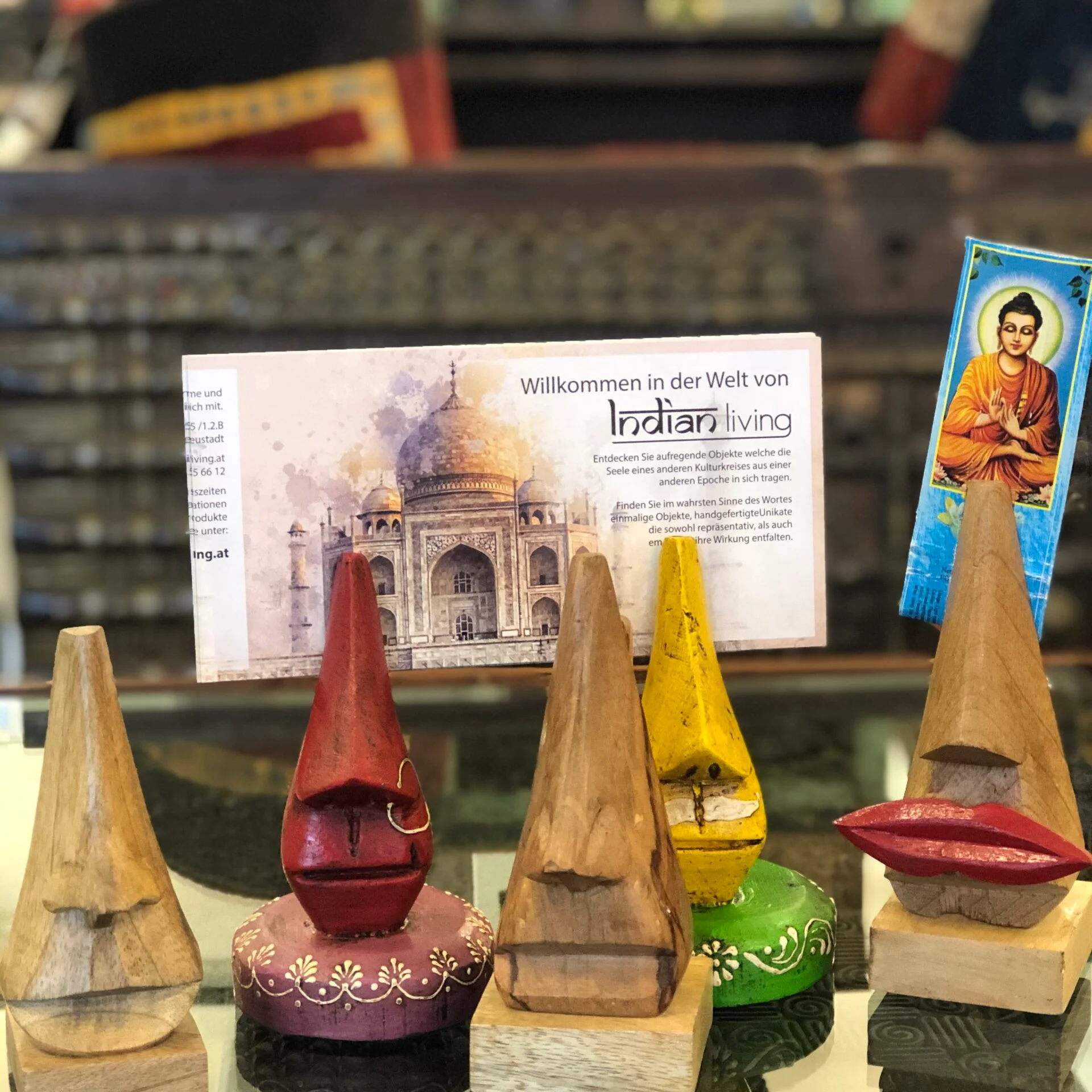 Handgeschnitzt aus massivem Holz, vereint dieser Sonnenbrillenhalter Funktionalität mit spielerischer Farbigkeit. Die kegelförmige Basis trägt skulpturale Aufsätze — bemalt in kräftigem Rot, Gelb, Grün oder naturbelassen, teils mit feinen floralen Mustern verziert. Jedes Stück ist ein Unikat, die Lackierung zeigt leichte Gebrauchsspuren, die den handwerklichen Charakter unterstreichen. Auf deiner Kommode oder dem Sideboard wird es zum charmanten Hingucker, der Ordnung hält und gleichzeitig Farbe ins Interieur bringt.