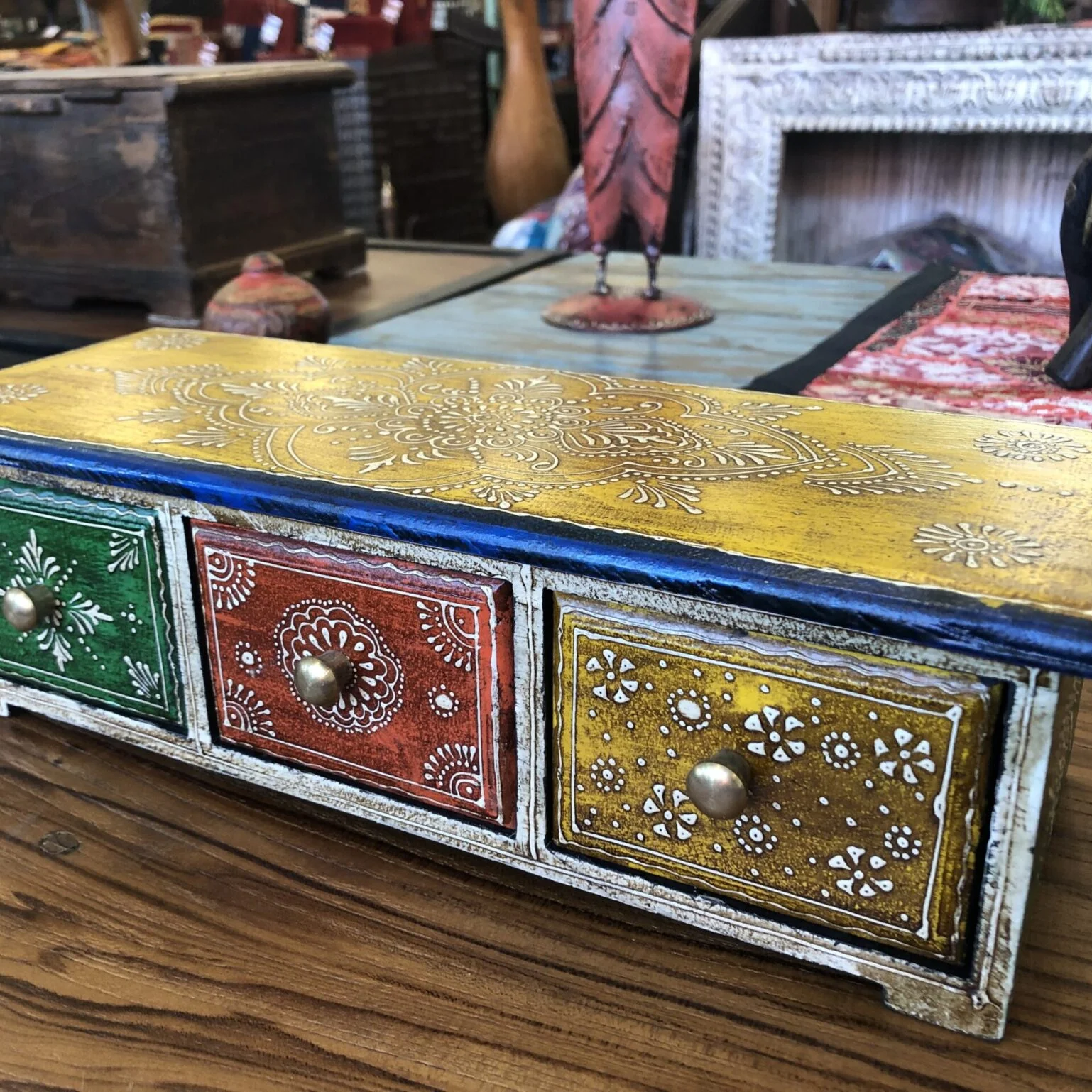Handbemaltes Mangoholz trifft auf traditionelle Ornamentik — dieses kompakte Schatzkästchen mit drei Schubladen zeigt sich in leuchtenden Farbtönen von Senfgelb über Rostrot bis Smaragdgrün. Jede Schublade trägt ein eigenes florales Muster in weißer Punktmalerei, die Messingknäufe und der weiß gesetzte Rahmen betonen den verspielten Charakter. Auf Kommode, Nachttisch oder Schreibtisch wird es zum farbenfrohen Ordnungshelfer für Schmuck, Stifte oder kleine Erinnerungsstücke.