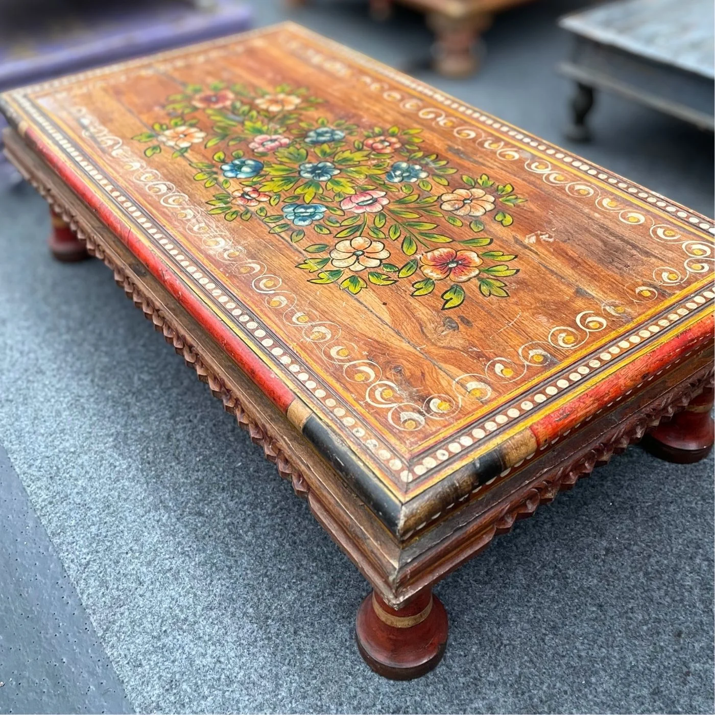 Dieser kleine, verzierte Bodentisch aus Holz begeistert durch seine liebevoll bemalte Tischplatte und seinen warmen, handwerklichen Charakter. Die floralen Ornamente und feinen Bordüren verleihen dem Tisch eine besondere Ausstrahlung und machen ihn zu einem echten Blickfang.Dank seiner stabilen Bauweise und der kompakten Form eignet sich dieser Tisch nicht nur als klassischer Bodentisch oder Teetisch, sondern auch hervorragend als niedriger Couchtisch. Die gedrechselten Füße sorgen für Standfestigkeit, während die sichtbare Patina und kleine Gebrauchsspuren den authentischen Charme unterstreichen.Ob als dekorativer Mittelpunkt im Wohnraum, als Unterlage für Bücher, Kerzen oder Skulpturen oder als gemütlicher Couchtisch in entspannter Atmosphäre – dieses Möbelstück verbindet Funktionalität mit handwerklicher Schönheit.Hinweis: Die auf den Fotos sichtbare Dekoration ist nicht im Preis inbegriffen, kann jedoch separat im Geschäft erworben werden