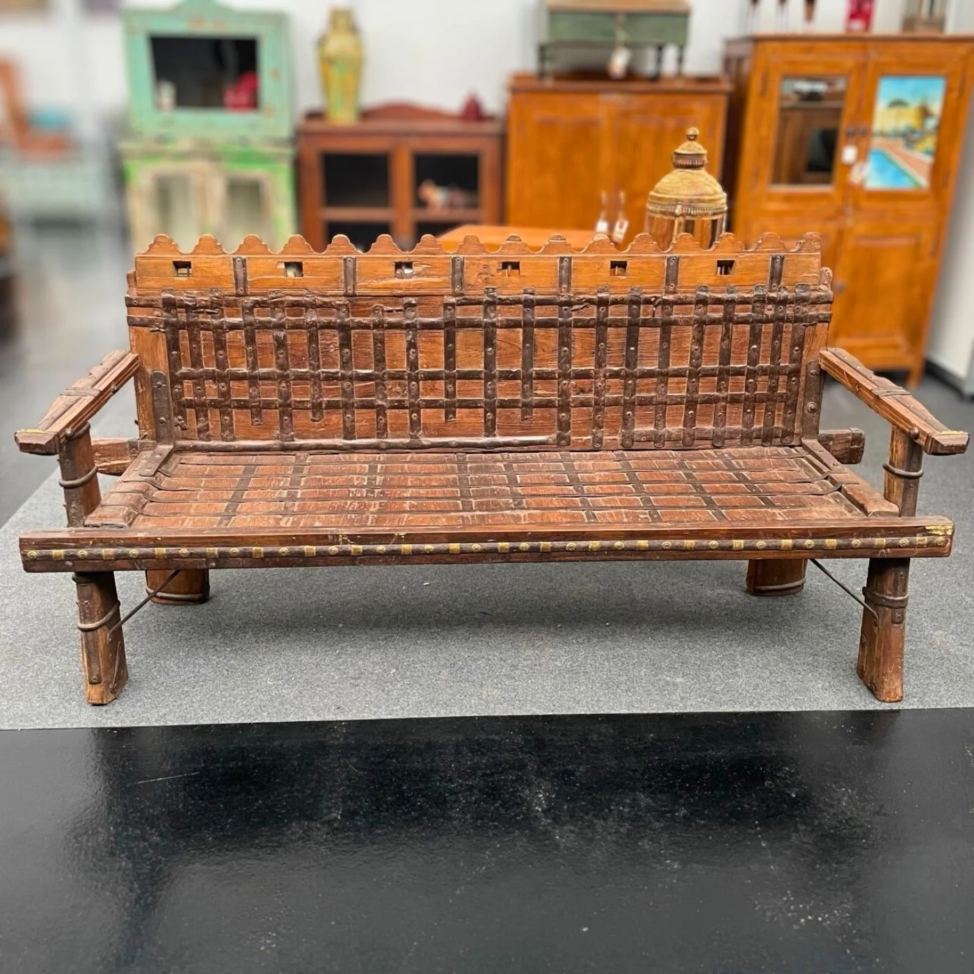Handgefertigte Sitzbank aus massivem Holz mit traditioneller indischer Formgebung — die aufwendig gedrechselten Säulenbeine und die charakteristischen Zinnen entlang der Rückenlehne verraten jahrzehntelange Handwerkskunst. Sitz- und Rückenfläche bestehen aus parallel verlegten Holzstäben, die jeweils mit feinen Messingnieten fixiert sind, das Holz zeigt natürliche Altersspuren und eine warme, gelebte Patina. Die Armlehnen greifen die geometrische Struktur auf und geben der Bank eine fast architektonische Anmutung. Ideal als Sitzgelegenheit mit Charakter in Flur, Wintergarten oder auf einer überdachten Veranda — ein Stück, das Platz für mehrere Personen bietet und jeden Raum prägt.