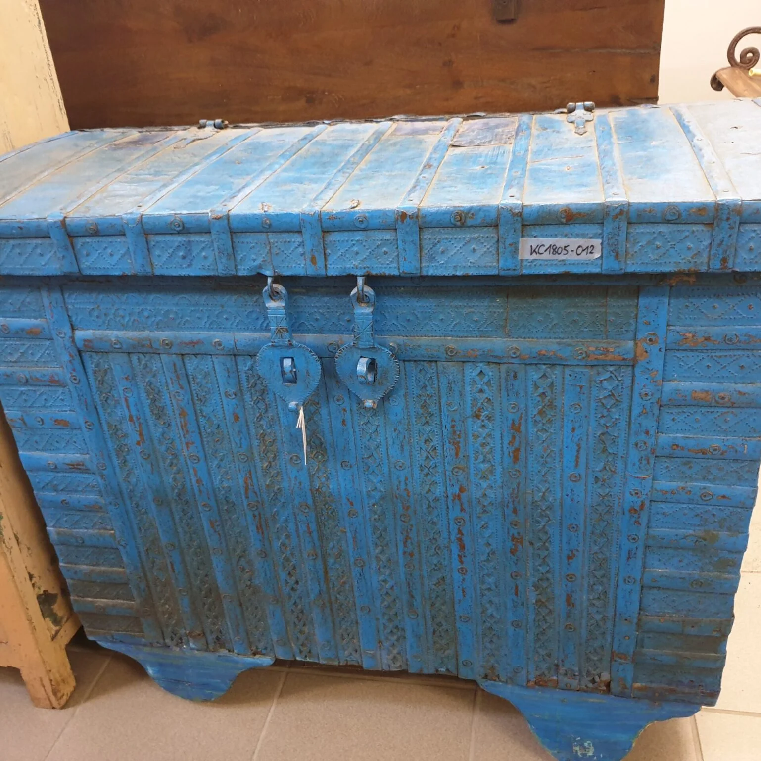 Kräftiges Blau trifft auf massives Holz – diese Truhe trägt die Spuren vieler Jahre in jeder Farbschicht und jeder Niete. Die breiten Metallbänder und der robuste Verschluss erinnern an Reisekisten aus einer Zeit, in der Möbel noch für Generationen gebaut wurden. Gebrauchsspuren und abgeplatzter Lack verleihen dem Stück seinen authentischen Charakter, die sichtbare Konstruktion zeigt handwerkliche Solidität. Als Couchtisch, Bettende oder einfach als Stauraum fügt sie jedem Raum eine Geschichte hinzu.