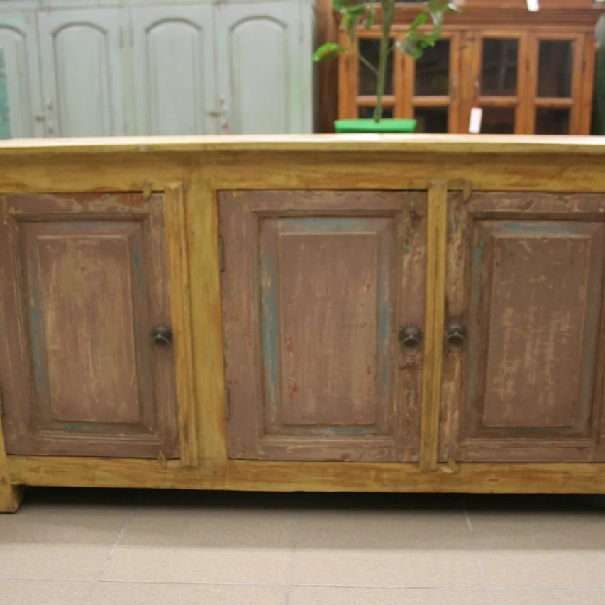 Aus recyceltem Altholz gefertigt, trägt diese Kommode die Spuren ihrer früheren Leben — jede Tür zeigt eine andere Schattierung, von verwittertem Gelb über blasse Rosa- und Grüntöne bis zu warmem Honigbraun. Die drei kassettierten Türfronten mit ihren schlichten Metallgriffen offenbaren handwerkliche Detailarbeit, die massiven Holzfüße geben dem Stück eine ruhige Standfestigkeit. Perfekt als Sideboard im Wohnbereich, wo die natürliche Patina des Holzes Charakter entfaltet und Geschichte greifbar wird.