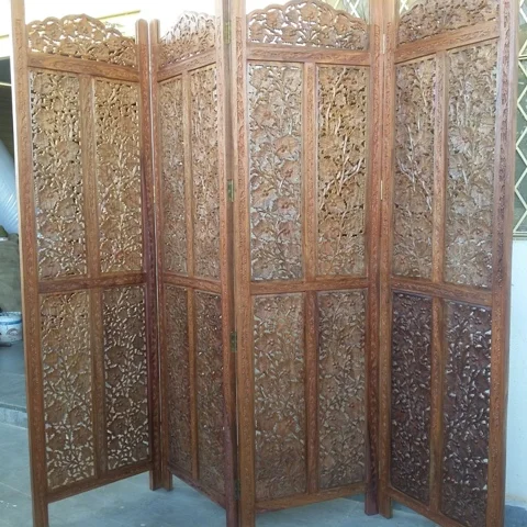Handgeschnitzte Blütenranken verdichten sich zu einem filigranen Relief, das Licht und Schatten in sanften Mustern durch den Raum trägt. Der Paravent besteht aus vier Flügelpaneelen in massivem Holz, jedes Feld von Rahmen gefasst, die Oberfläche in warmem Honigbraun gehalten und von natürlicher Maserung durchzogen. Die Scharniere erlauben dir, den Raumteiler flexibel zu falten und ihn so an verschiedene Situationen anzupassen. Er gliedert offene Bereiche, ohne sie abzuschotten — Privatsphäre entsteht durch ornamentale Transparenz.