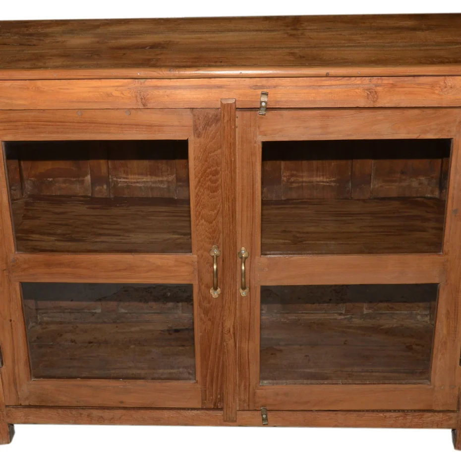Helles Teakholz umschließt vier verglaste Fächer, in denen deine Lieblingsstücke sichtbar, aber geschützt ruhen. Die schlichte Rahmenkonstruktion mit ihren feinen Messinggriffen und -riegeln zeigt handwerkliches Können ohne Schnörkel — jede Verbindung sitzt präzise, das Glas liegt plan in den gefrästen Nuten. Du siehst die warme Maserung des gealterten Holzes, das durch Gebrauch eine sanfte Patina entwickelt hat. Als flaches Aufsatzmöbel eignet es sich perfekt für Kommoden oder Sideboards, wo es Ordnung schafft und gleichzeitig den Blick auf das Innere freigibt.