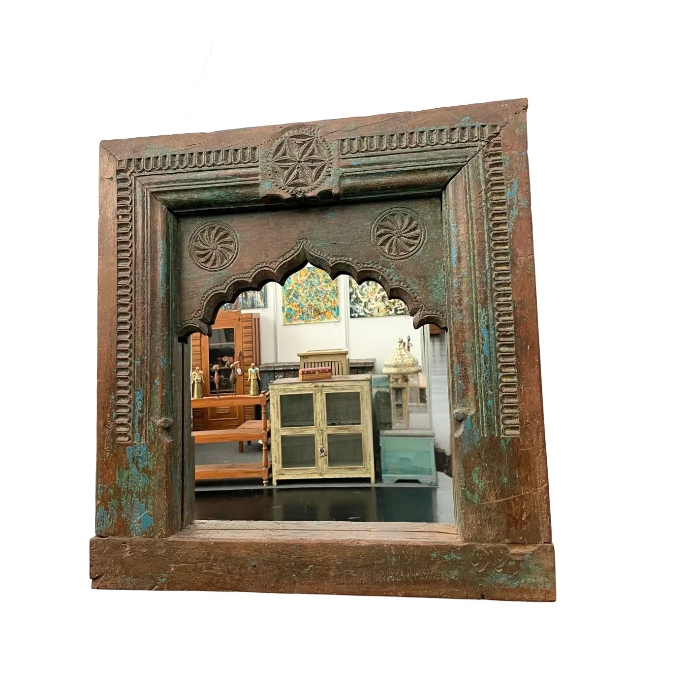 Altholz mit Patina: Der geschnitzte Rahmen trägt Spuren vieler Jahre, die abgeblätterte türkise Farbe wechselt sich mit naturbelassenem Holz ab, jede Unebenheit erzählt von früherem Gebrauch. Der bogenförmige Durchbruch und die floralen Medaillons sind von Hand gearbeitet, die geschwungene Kontur verleiht dem Spiegel einen Hauch Architektur. An deiner Wand wird er zum ruhigen Blickfang — ein Stück, das Vergangenheit ins Heute holt und jeden Raum mit gelebter Geschichte bereichert.