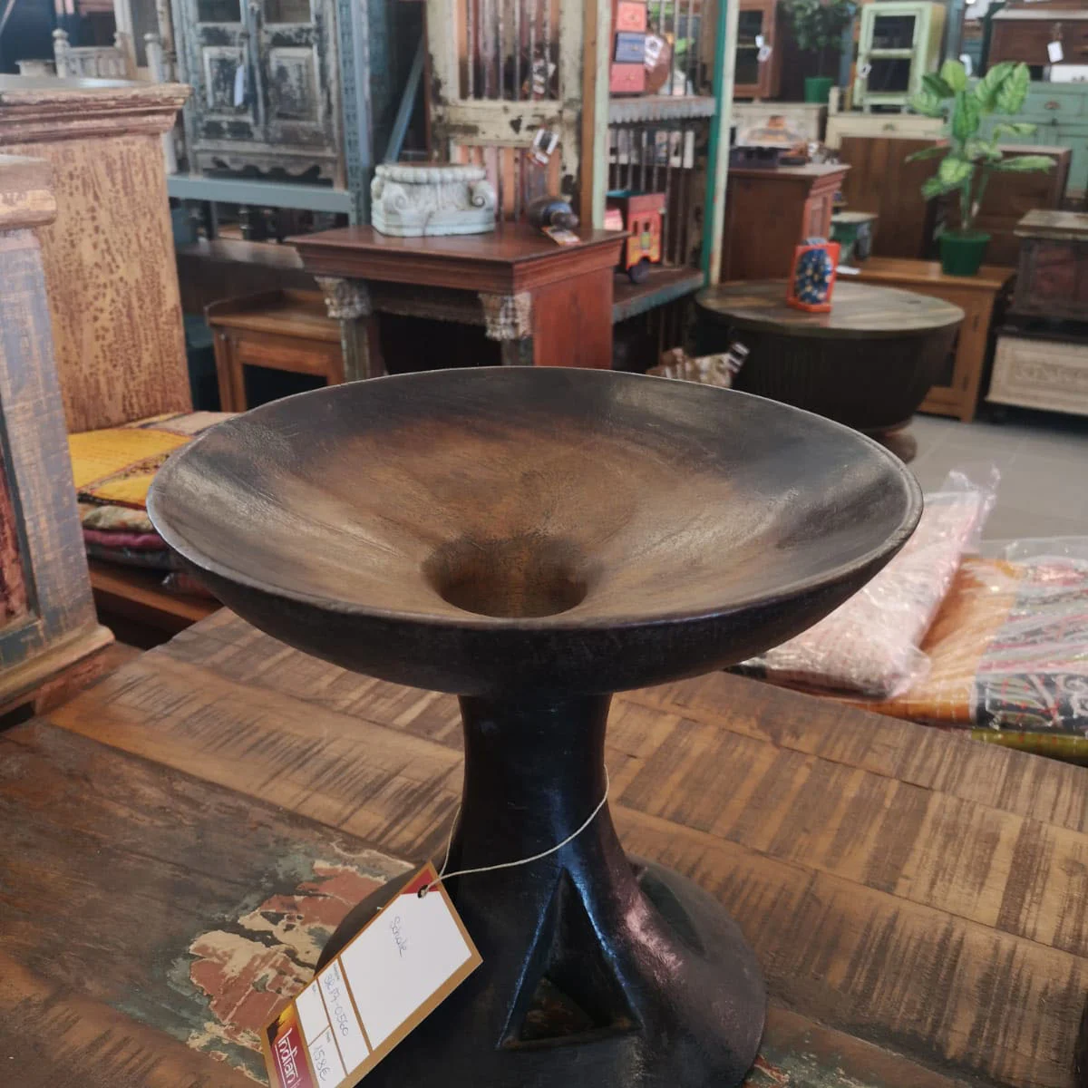 Aus dunklem Hartholz gedreht, ruht diese Schale auf einem kräftigen, konisch zulaufenden Fuß. Die Oberfläche ist matt poliert, die Maserung schimmert in warmen Brauntönen, fast schwarz an den Kanten. Ihre Form erinnert an traditionelle Opferschalen – eine schlichte, archaische Präsenz. Auf dem Esstisch nimmt sie Obst oder Brot auf, im Sideboard wird sie zum skulpturalen Akzent.
