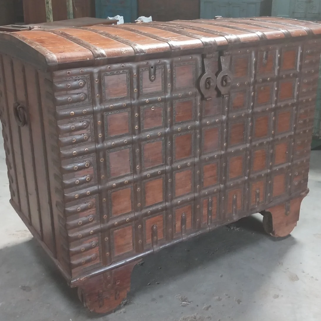 Massive Eisenbeschläge ummanteln jeden Zentimeter dieser imposanten Truhe aus dunklem Holz — ein Stück, das an Schatzkammern und alte Handelsrouten erinnert. Die gewölbte Deckplatte, die dicht gesetzten Nieten und die schweren Ringgriffe zeugen von einer Zeit, in der Aufbewahrung Schutz und Status bedeutete. Jede Schramme im Metall, jede Patina auf dem Holz erzählt von jahrzehntelangem Gebrauch, die robusten Füße tragen das Gewicht mit einer Selbstverständlichkeit, die nur alte Handwerkskunst kennt. In deinem Zuhause wird diese Truhe zum archaischen Blickfang — funktional als Stauraum, ästhetisch als Statement für Beständigkeit und Charakter.
