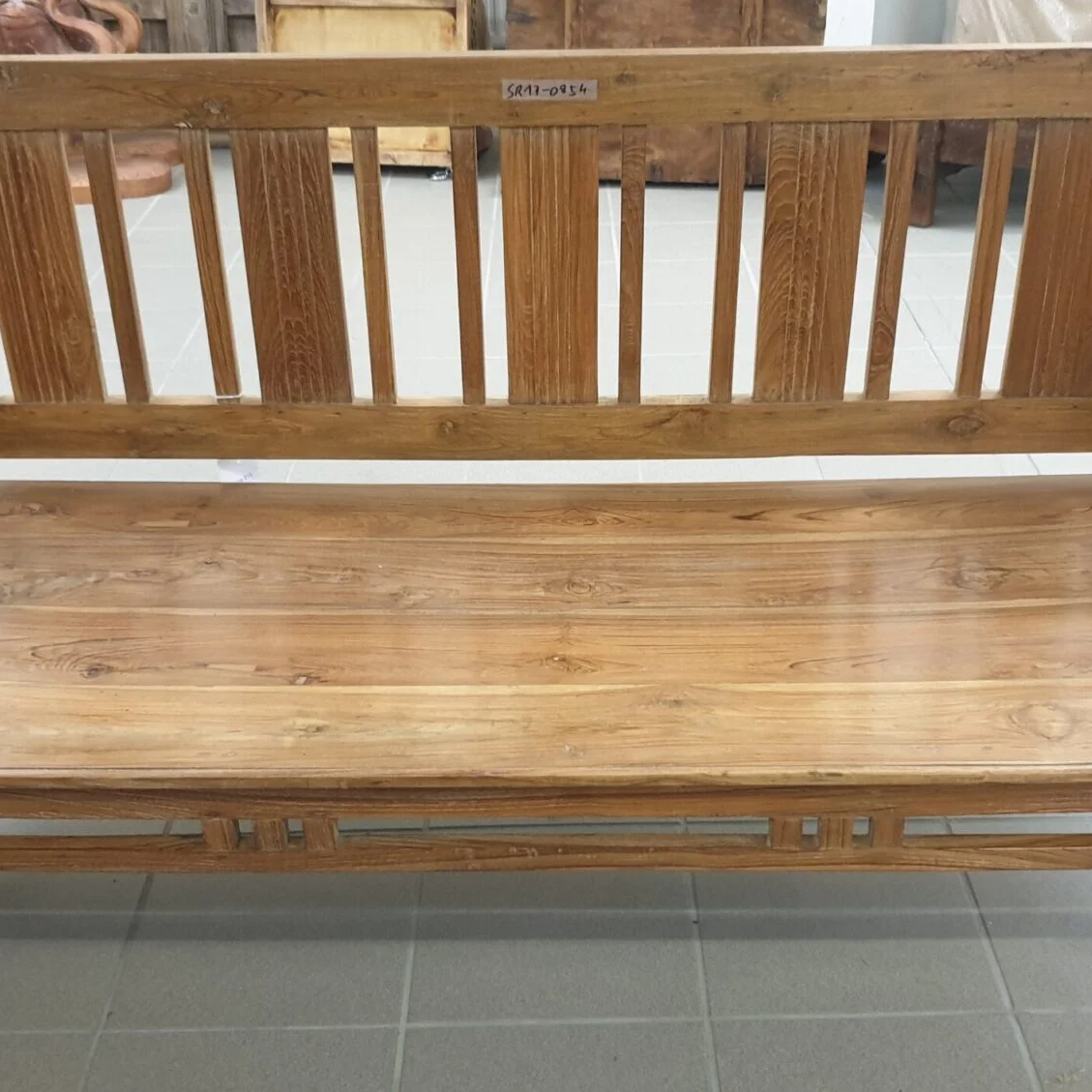 Handgefertigtes Teakholz prägt diese großzügige Sitzbank mit traditioneller Lattenrückenlehne und durchbrochener Basis. Die natürliche Maserung jeder einzelnen Latte zeichnet sich klar ab, die hellen und dunklen Töne des Holzes spielen ineinander, die Oberfläche trägt die matte Patina jahrelanger Nutzung. In deinem Eingangsbereich oder auf der überdachten Terrasse bietet sie Platz für mehrere Personen und bringt robuste, unkomplizierte Gemütlichkeit mit.