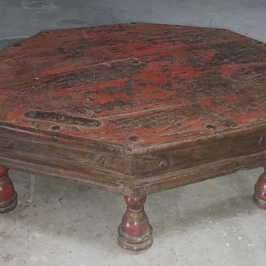Die abgeblätterte rote Lackierung auf der Tischplatte erzählt von jahrzehntelangem Gebrauch und trägt die unverwechselbare Patina alter indischer Möbel. Gedrechselte Beine in verblasstem Rot heben das massiv gearbeitete Holz leicht vom Boden, während Metallbeschläge an den Seiten auf eine frühere Funktion als Truhe oder Transportkiste hindeuten. Du erkennst die Spuren der Zeit in jeder Schramme, in jedem Farbabrieb — ein Stück, das Geschichten bewahrt. Als niedriger Couchtisch bringt es rustikalen Charakter und gelebte Geschichte in dein Wohnzimmer.