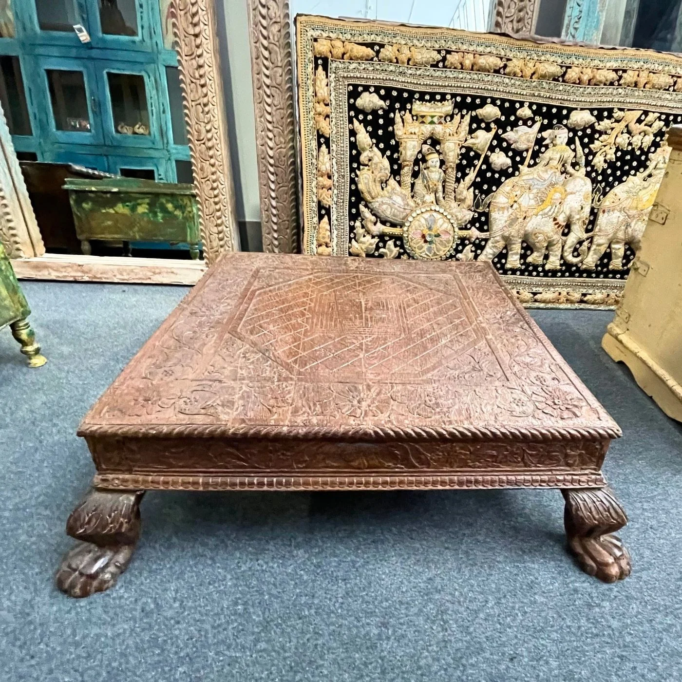 Ein bodennah platzierter Tisch aus dunkelbraunem Hartholz, dessen gesamte Oberfläche mit floralen und geometrischen Schnitzereien überzogen ist. Die kräftigen Löwenfüße tragen das Möbel mit skulpturaler Präsenz, während eine umlaufende Perlstableiste die Platte elegant abschließt. Das zentrale Rautenmuster wird von üppigem Rankenwerk gerahmt — jede Linie von Hand ins Holz gearbeitet, jede Fläche bewusst gestaltet. Als niedriger Beistelltisch vor dem Sofa oder als Podest für Tee und Bücher wird es zum ruhigen Fixpunkt im Raum.