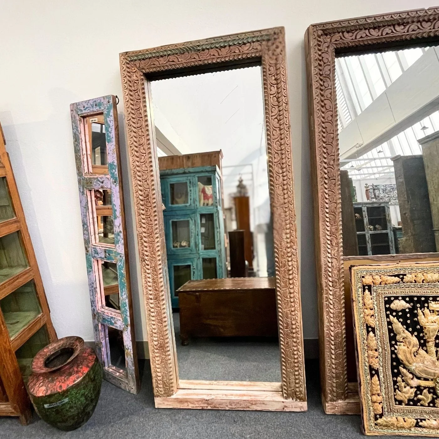 Handgeschnitzte Rankenornamente winden sich über den breiten Holzrahmen, jede Blüte und jedes Blatt von Hand ins Holz getrieben. Die Oberfläche changiert zwischen zartem Rosa, verblasstem Grün und natürlichem Beige — Farben, die von Jahrzehnten Gebrauch erzählen und dem Ganzen eine sanfte, gelebte Patina verleihen. In langen Fluren oder großen Räumen schafft es vertikale Eleganz und weitet den Raum, ohne sich aufzudrängen.