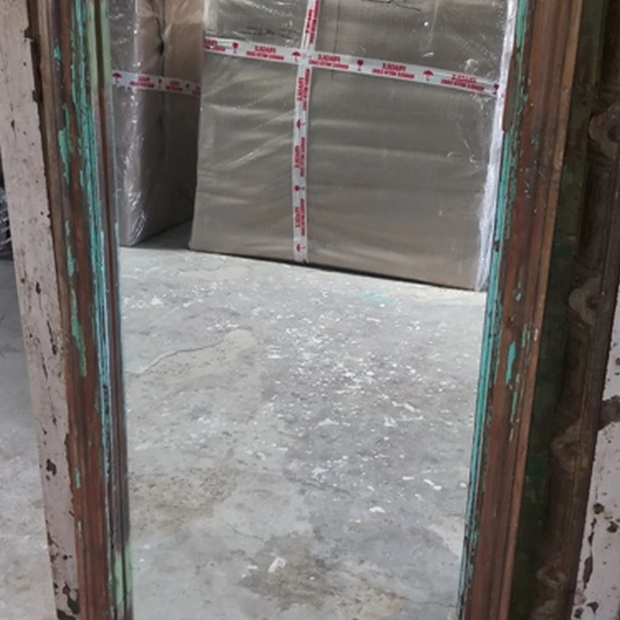 Der schmale Holzrahmen trägt die sichtbaren Spuren vergangener Nutzung — abgeblätterte Lackschichten in Braun und Türkis legen die gewachsene Geschichte frei. Das Glas selbst zeigt die typische Patina alter Spiegel, leicht matt und mit feinen Gebrauchsspuren, die dem Raum eine sanfte, gelebte Atmosphäre geben. Hochkant gelehnt oder an der Wand montiert, wird dieser Spiegel zum zurückhaltenden Akzent in Flur oder Schlafzimmer, der den Blick einfängt ohne zu dominieren.
