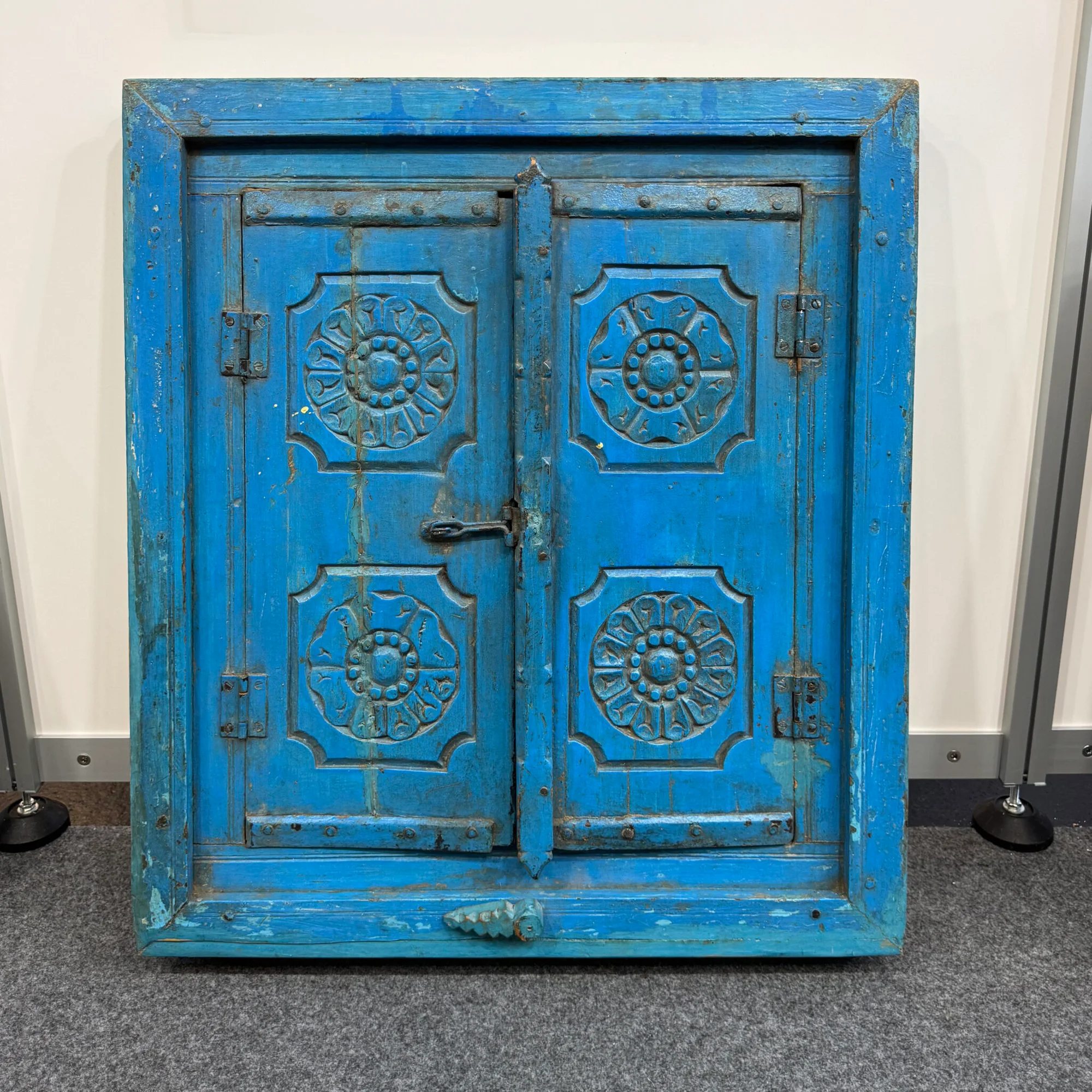 Einzigartiger Fensterspiegel für Ihr HeimDieser markante Fensterspiegel besticht durch seinen Rahmen aus echtem, historischem Altholz. Das Möbelstück zeigt zudem eine lebendige blaue Farbgebung, die im authentischen Shabby Chic Stil gehalten ist. Deshalb eignet sich dieses Objekt hervorragend als farbiger Akzent in Ihrem Badezimmer oder Flur. Das verarbeitete Echtholz garantiert überdies eine hohe Langlebigkeit und eine robuste Haptik. Somit investieren Sie in ein nachhaltiges Produkt mit viel historischem Charme. Darüber hinaus passt das rustikale Design folglich ideal zu individuellen Einrichtungsstilen. Ein solches Unikat lässt sich zudem wunderbar mit weiteren Vintage-Möbeln aus unserem Sortiment kombinieren. Folglich wertet das Stück jede Wand sofort optisch auf und schafft eine behagliche Wohnatmosphäre in Ihrem Zuhause.Handgefertigter Fensterspiegel mit GeschichteBei der Herstellung dieser Spiegel steht die traditionelle Handwerkskunst im Vordergrund. Diese dekorativen Wandspiegel überzeugen durch ihre Holzrahmen mit authentischer, gewachsener Patina. Die lebendigen Farbschichten und natürlichen Gebrauchsspuren verleihen jedem Stück eine besondere Tiefe und unterstreichen den charaktervollen Vintage-Charme. Jeder Spiegel ist ein handgefertigtes Einzelstück und bringt eine besondere, individuelle Ausstrahlung in Flur, Wohnbereich oder Schlafzimmer. Zudem schmücken kunstvolle Schnitzereien in Form von floralen Rosetten die Türen der Konstruktion. Deshalb ist dieses Modell ein wahres Unikat für Kenner von Ethno-Dekor. Durch die richtige Pflege dieser Oberflächen bleibt die natürliche Schönheit über viele Jahre hinweg perfekt erhalten. Somit sichern Sie sich ein langlebiges Kunstwerk für Ihre vier Wände.Praktische Details am Fensterspiegel entdeckenDie Spiegelfläche wird zudem durch zwei aufklappbare Holztüren geschützt. Diese Türen verfügen darüber hinaus über einen funktionalen Metallverschluss und nostalgische Scharniere. Folglich können Sie das Aussehen des Wandobjekts nach Belieben verändern. Die detaillierten Schnitzereien auf der Vorderseite betonen somit die kunstvolle Ausführung dieses Einzelstücks. Zudem sorgt die kompakte Bauweise für eine einfache Platzierung an fast jeder Wandfläche in Ihrem Zuhause. Deshalb stellt das Produkt die perfekte Verbindung aus praktischem Nutzen und dekorativer Kunst dar. Folglich ist er eine Bereicherung für jedes stilbewusste Heim, das Wert auf echte Authentizität legt. Die blaue Aura vom Echtholz schafft zudem eine warme Stimmung in Ihrem Eingangsbereich. Somit fühlen sich Ihre Gäste sofort willkommen und wohl.
