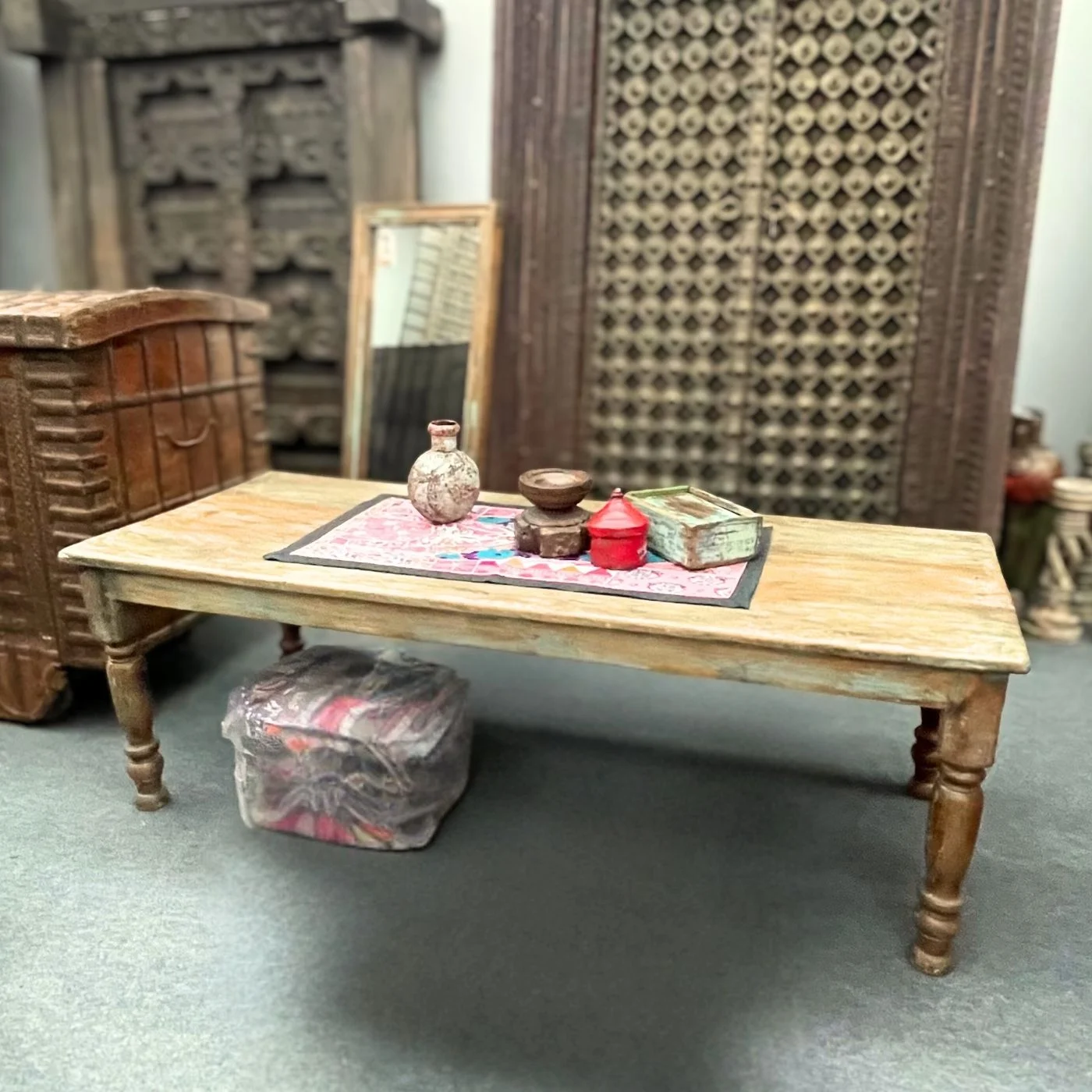 Die massiven Tischbeine aus gedrechseltem Holz tragen eine breite Platte, deren helle Oberfläche von unzähligen Gebrauchsspuren gezeichnet ist — jede Kerbe, jeder Fleck erzählt vom langen Leben dieses Tisches. Du erkennst die ursprüngliche Zimmermannstechnik in den sichtbaren Verbindungen, das Holz zeigt stellenweise zarte Türkis- und Grüntöne unter der abgegriffenen Lasur. Als Couchtisch gibt er deinem Raum Tiefe und Ruhe, ohne aufzudrängen — er ist einfach da, geerdet und echt.