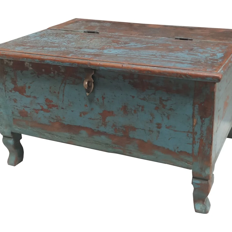 Die abgeblätterte türkisfarbene Lackierung auf dem massiven Holz erzählt von Jahrzehnten des Gebrauchs – jede Abnutzungsspur ist ein Zeichen gelebter Geschichte. Die gewölbte Deckplatte mit integrierter Öffnung und der schlichte Messingbeschlag zeigen traditionelle indische Truhenhandwerkskunst, die geschwungenen Beine verleihen dem kompakten Stück eine leichte Eleganz. Ob als Beistelltisch, Aufbewahrung für Decken oder als charakterstarker Blickfang im Flur – dieses Möbel bringt Farbe und Authentizität in jeden Raum.