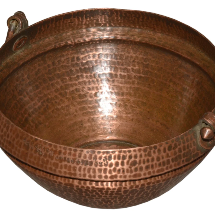 Handgehämmert aus Kupfer, trägt diese Schale die lebendige Struktur unzähliger Hammerschläge auf ihrer Oberfläche. Die beiden seitlichen Henkel sind fest genietet, das Metall zeigt eine warme, gelebte Patina zwischen Kupferrot und gedämpftem Bronze. Jede Delle, jede Unebenheit erzählt von traditioneller Schmiedekunst, die Form ist klar und funktional zugleich. Ob als Pflanzschale, Obstkorb oder schlicht als Blickfang auf dem Sideboard — das Stück bringt warme Metallakzente in deine Räume.