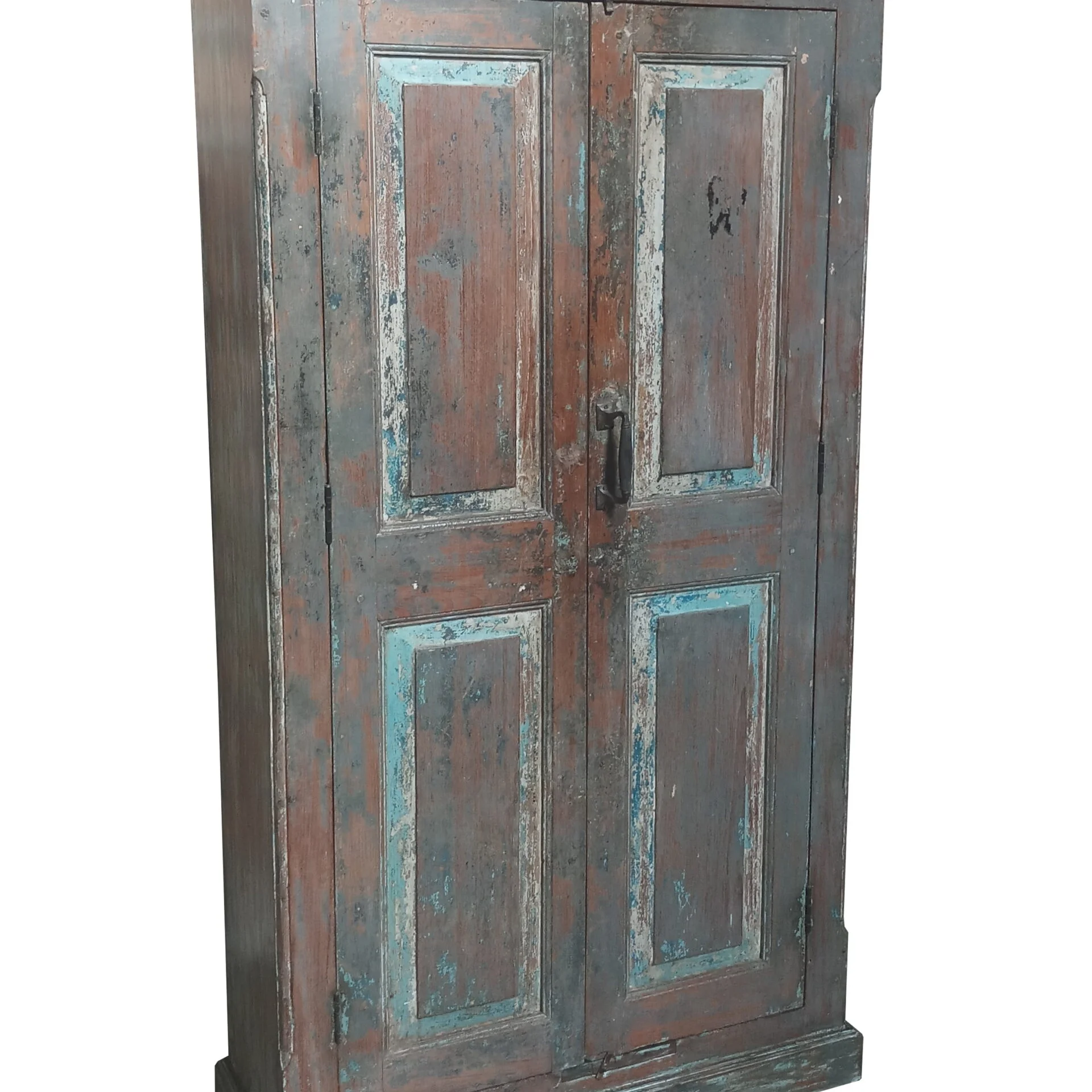 Die Holztüren dieses Almirahs tragen eine Patina aus türkis, grau und rotbraun — ein Farbenspiel, das von jahrzehntelangem Gebrauch und natürlichem Abrieb erzählt. Jede Kassettentür zeigt eine andere Schattierung, die Rahmungen heben sich in matten Blautönen vom dunkleren Grund ab, die Oberfläche ist rau und ungleichmäßig. Der schlichte Metallgriff und die schweren Scharniere fügen sich ins rustikale Bild. In deinem Flur oder Schlafzimmer wird dieses Möbel zum stillen Charakterkopf — robust, gelebt und dabei unaufdringlich.