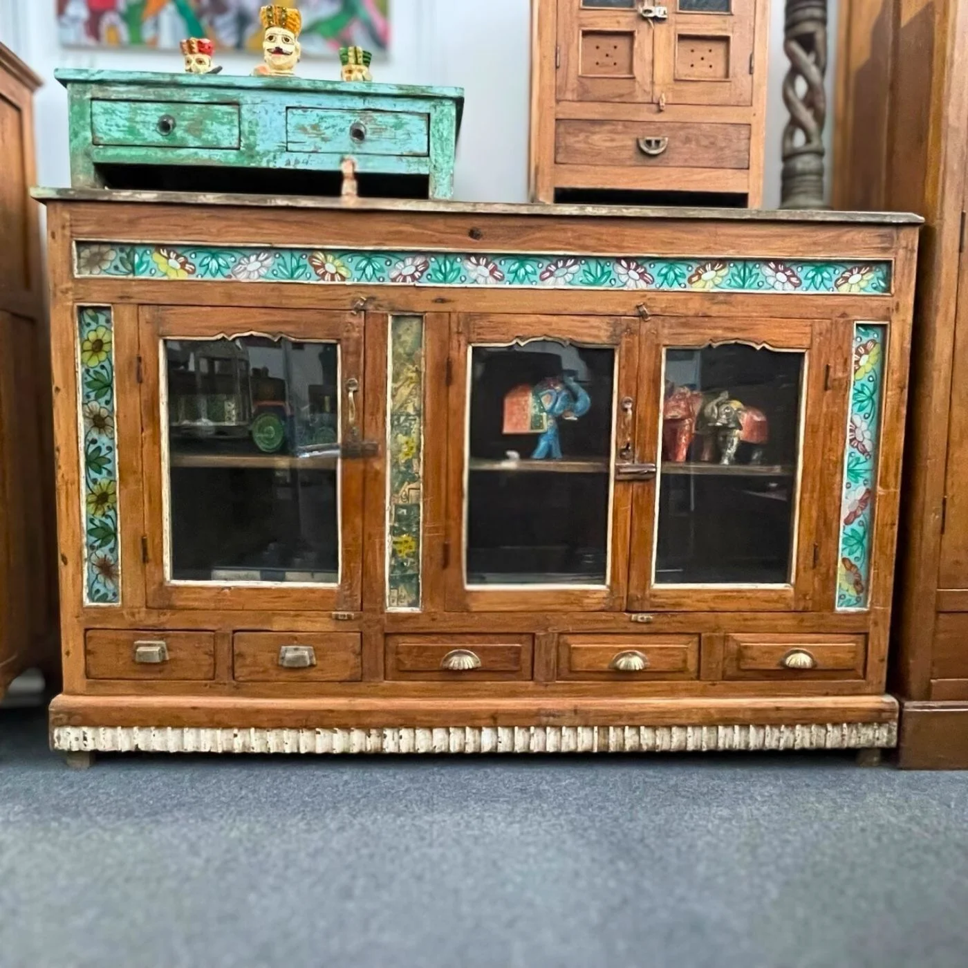Handbemalte Keramikfliesen in leuchtendem Türkis, Orange und Gelb rahmen die Front dieser Kommode aus gereiftem Massivholz — jede Blüte und jedes Blatt von Hand aufgetragen. Hinter den drei verglasten Türen und in den fünf Schubladen mit geschwungenen Messinggriffen bewahrt dieses Möbel auf, was dir wichtig ist, während die kunstvoll verzierte Sockelleiste aus Altholz dem Ganzen einen rustikalen Abschluss verleiht. Du spürst das Gewicht der Jahre im Holz, die Farbpigmente der Fliesen schimmern unterschiedlich je nach Lichteinfall. Als Sideboard im Essbereich oder als Vitrine im Flur setzt es einen farbenfrohen, handwerklich starken Akzent.