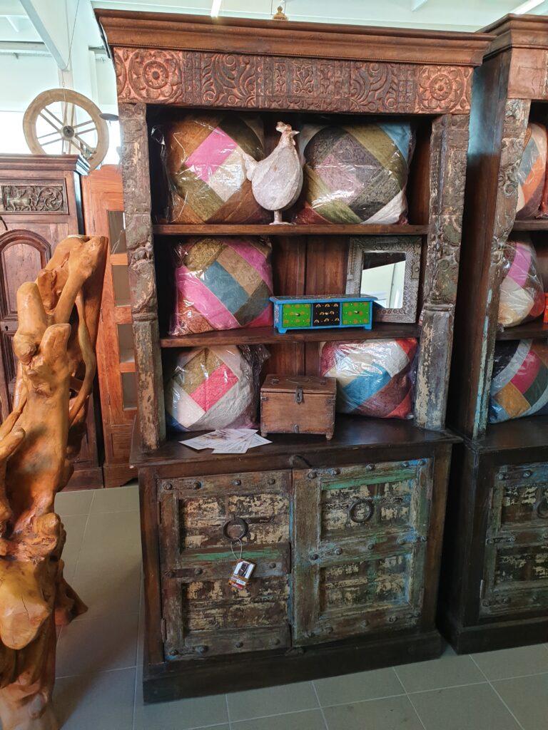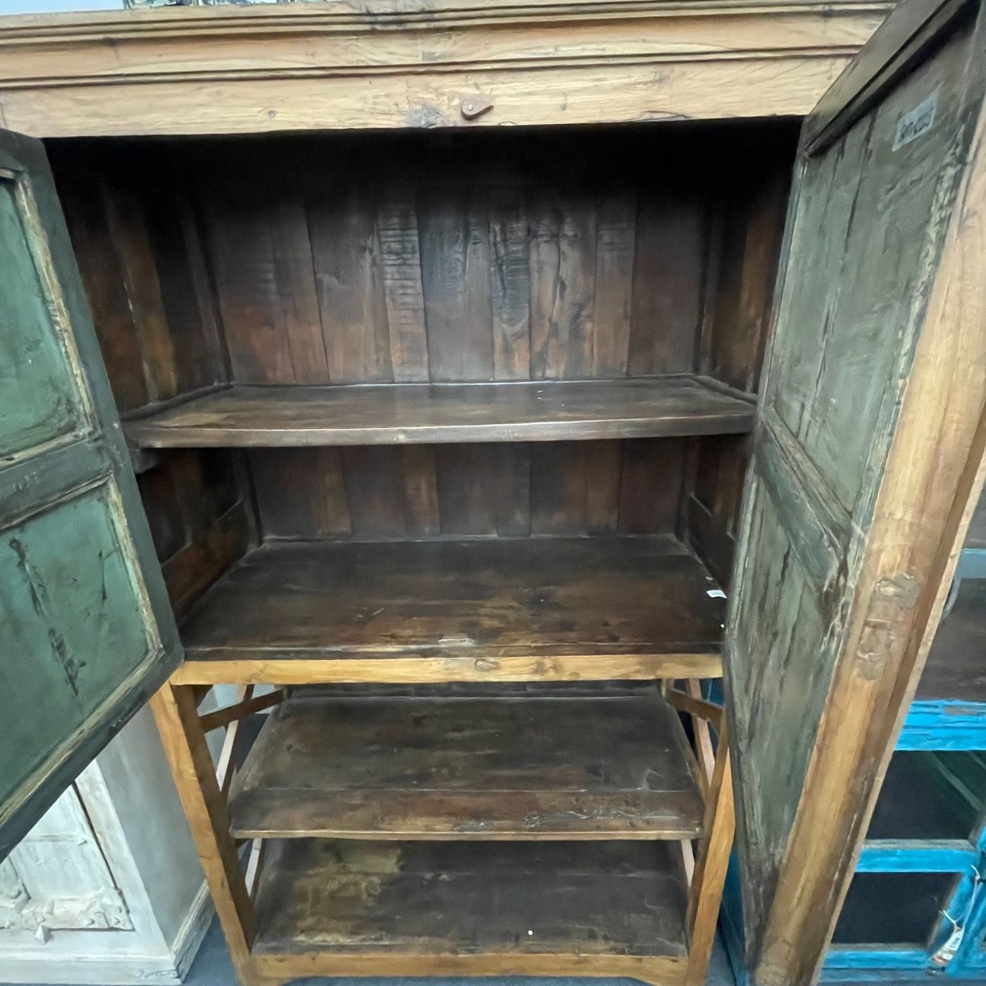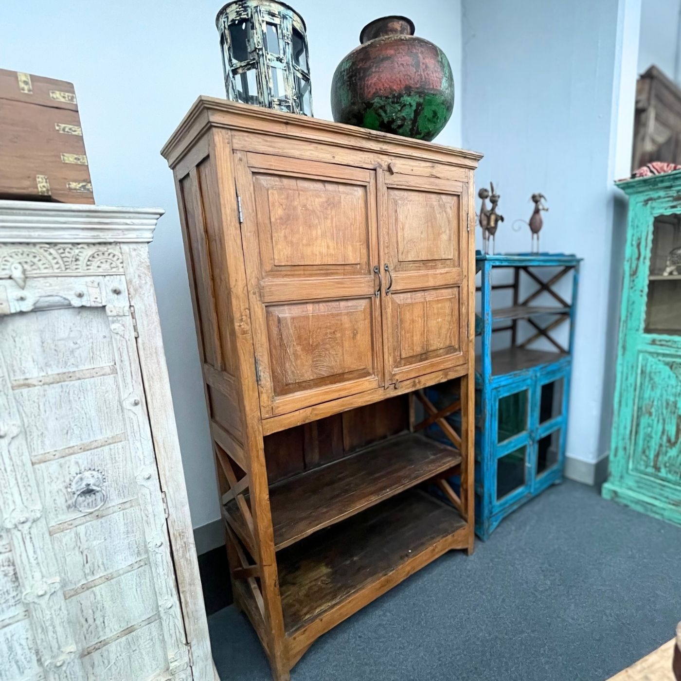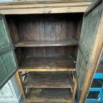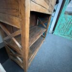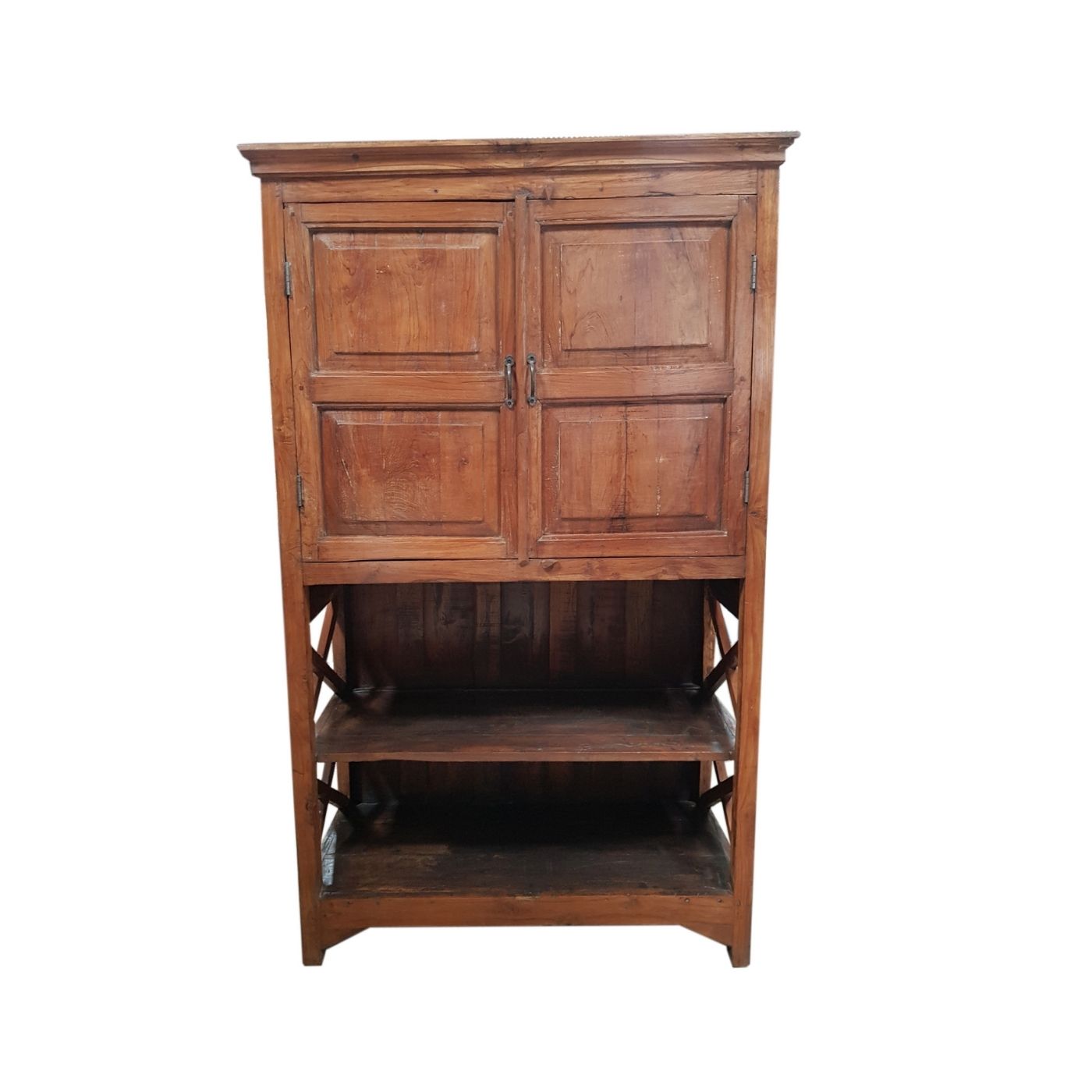 Die seitlichen Kreuzverstrebungen sind ein prägendes Gestaltungselement dieses Möbelstücks. Sie sorgen nicht nur für Stabilität, sondern unterstreichen auch den handwerklichen, ursprünglichen Stil des Schranks. Die natürliche Holzoberfläche mit sichtbarer Maserung, Gebrauchsspuren und kleinen Unregelmäßigkeiten verleiht jedem Stück seine individuelle Ausstrahlung.