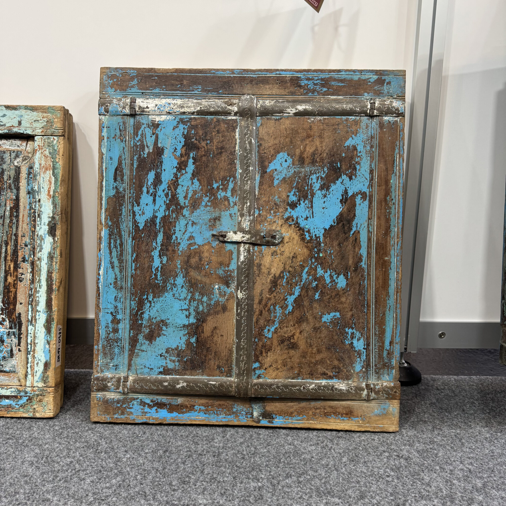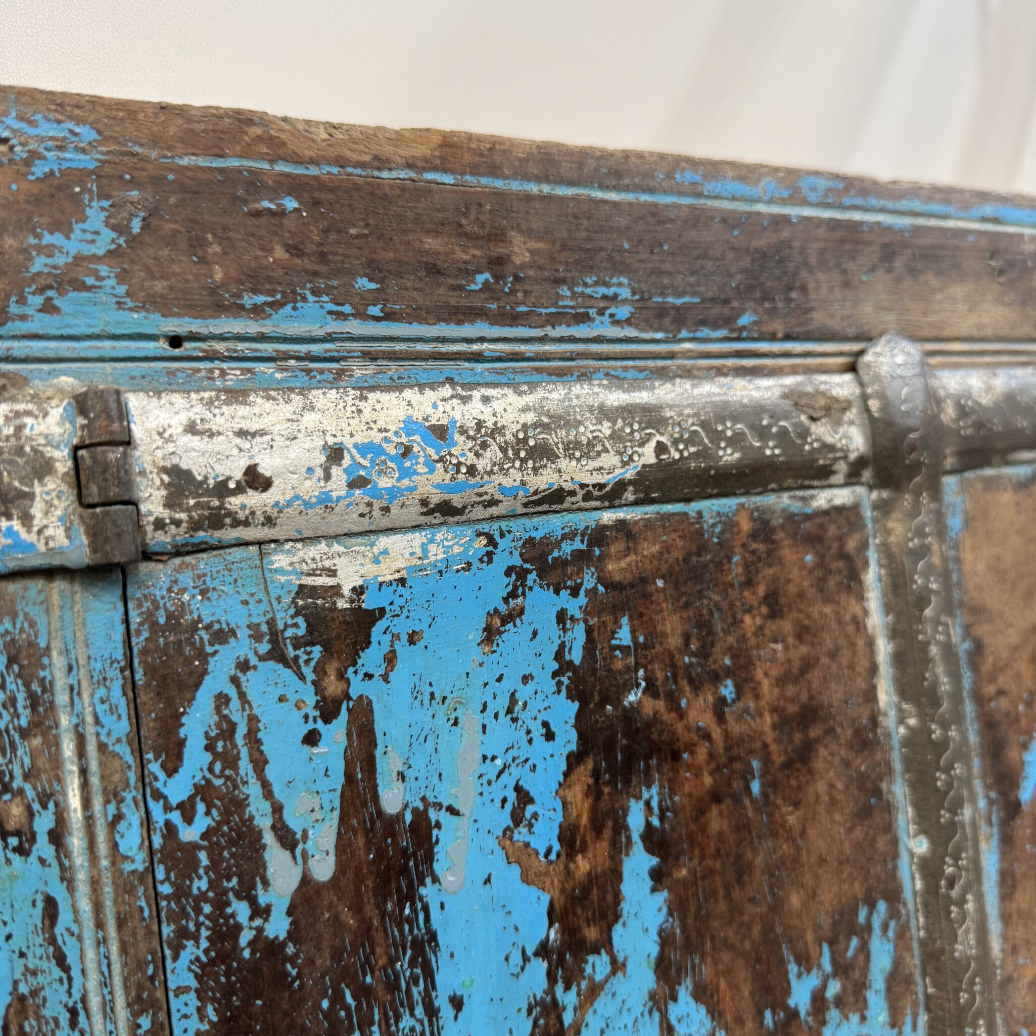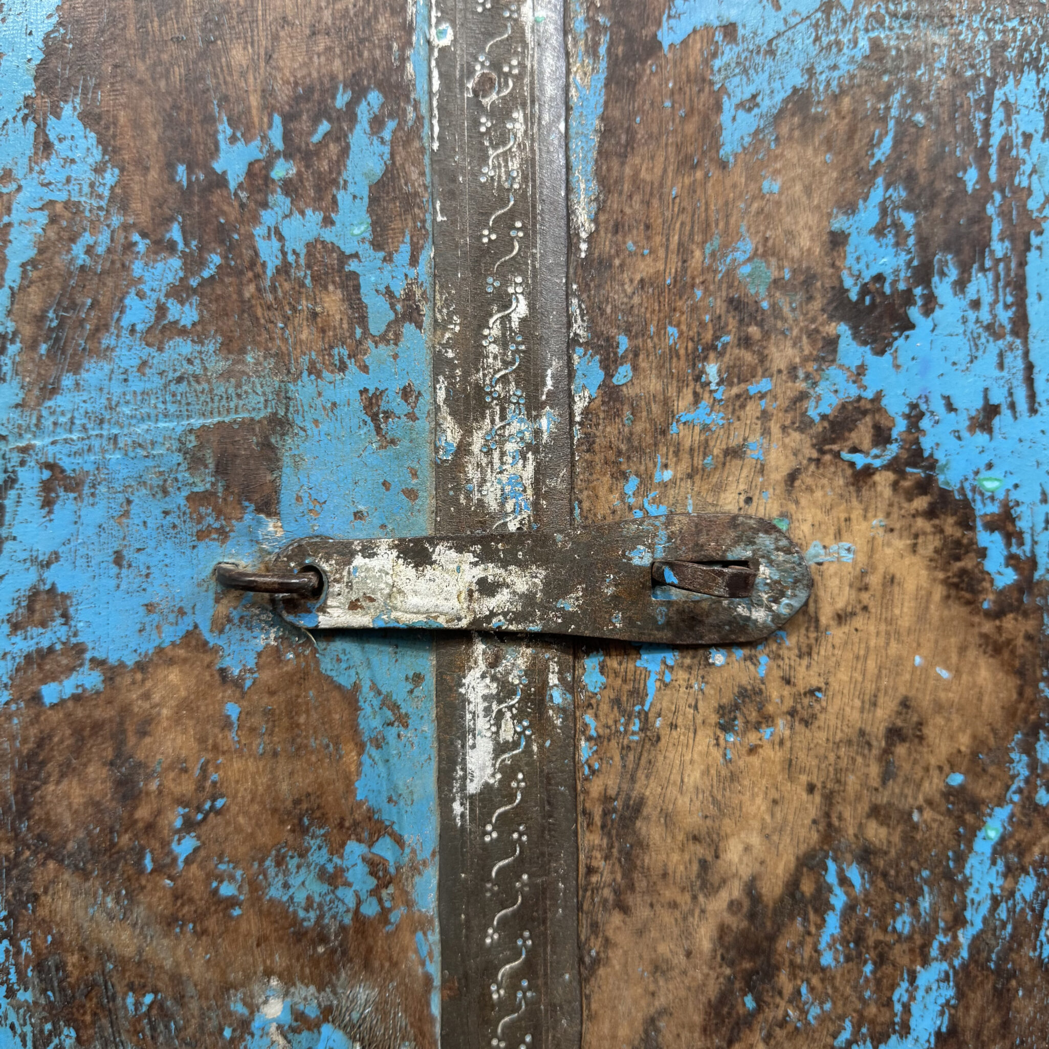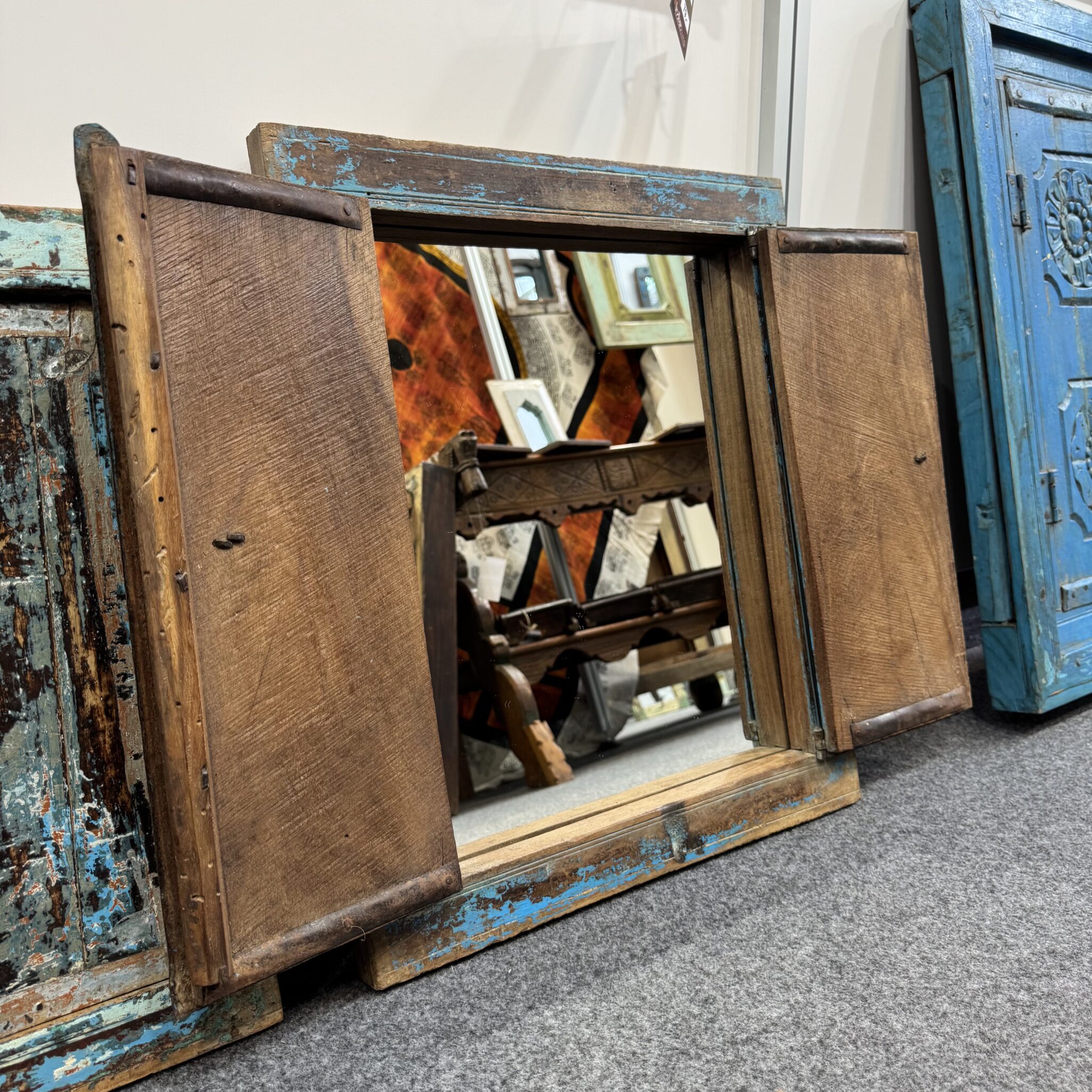 Dieses charmante Dekorationselement wurde aus recyceltem Echtholz gefertigt. Es handelt sich um ein originales indisches Fensterelement mit einer markanten blauen Lackierung. Die Farbe ist über die Jahre hinweg natürlich gealtert. Zudem verleiht die sichtbare Holzstruktur dem Rahmen eine rustikale Note. Jede Unvollkommenheit erzählt eine eigene Geschichte aus vergangenen Zeiten. Deshalb ist dieser Spiegel perfekt für Individualisten geeignet. Das Design erinnert an sonnige Tage in fernen Ländern. Folglich bringt das Stück eine fröhliche Atmosphäre in Ihr Zuhause. Die robuste Bauweise sorgt zudem für eine hohe Wertigkeit. Somit investieren Sie in ein langlebiges Kunstobjekt.