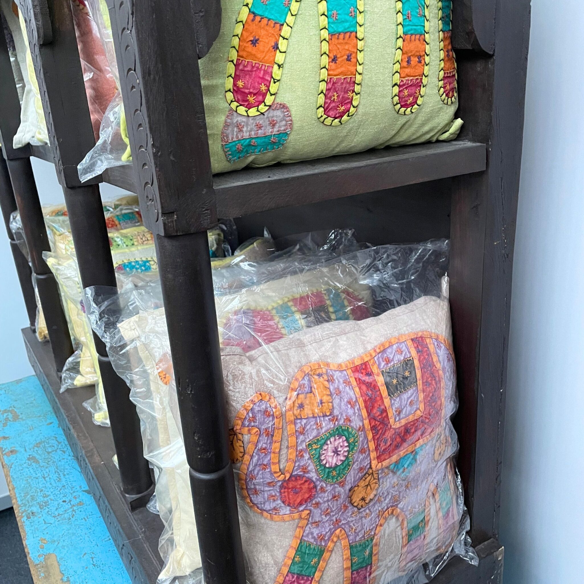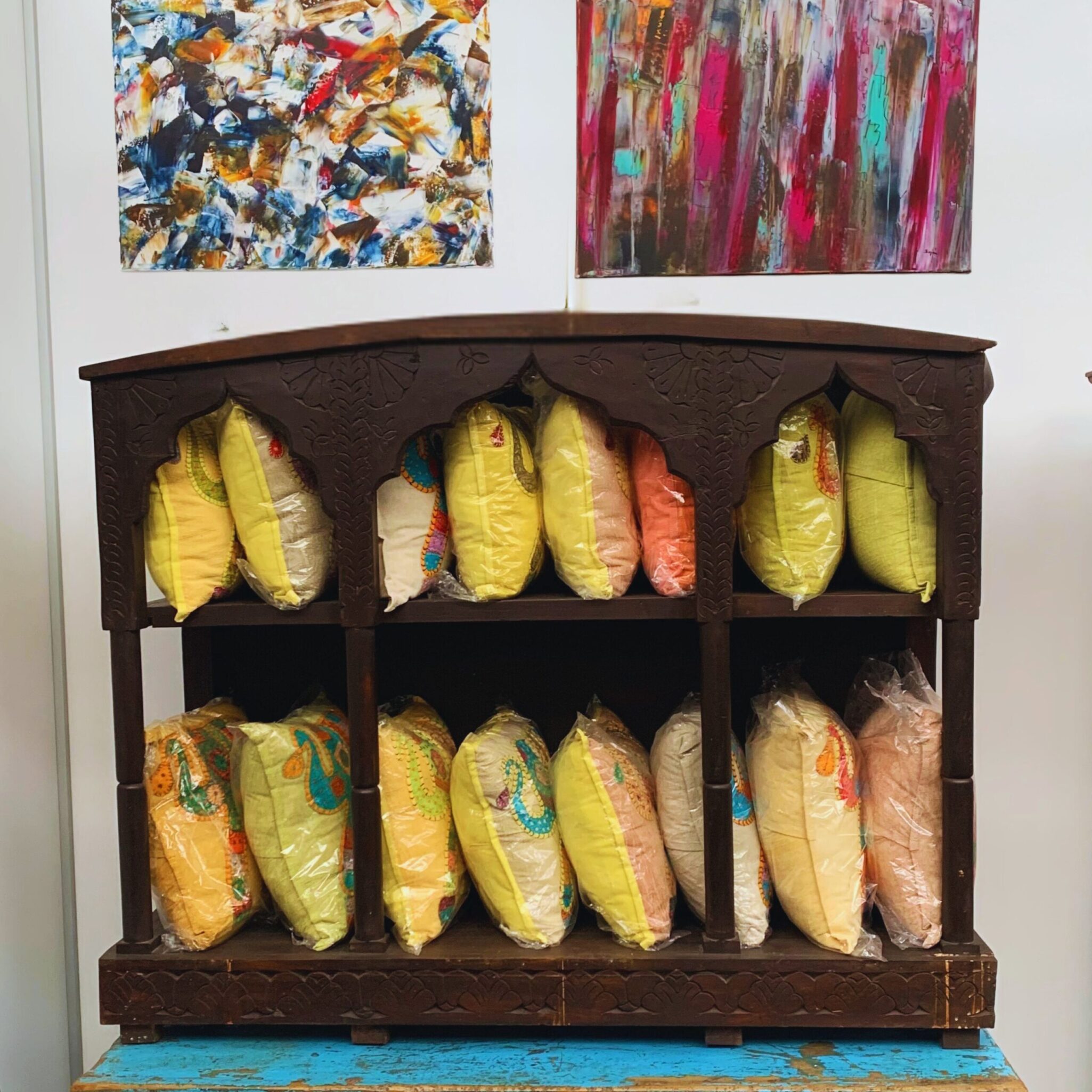 Diese handgefertigte Weinbar aus massivem Holz ist ein einzigartiges Stück indischer Handwerkskunst.