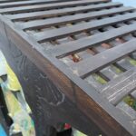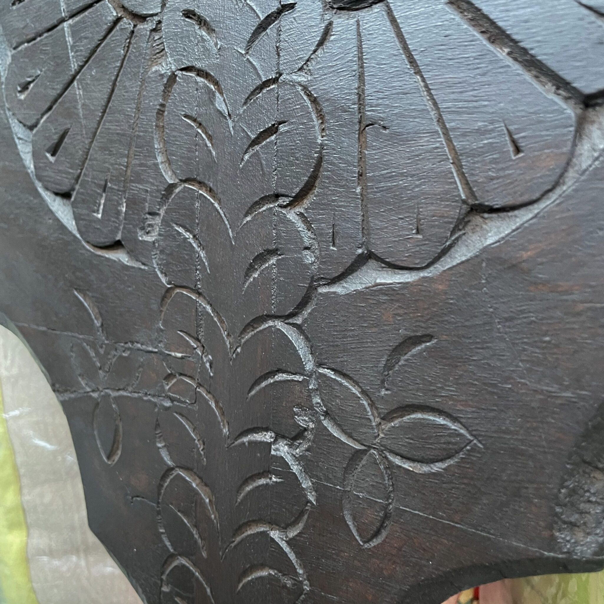 Feine Schnitzereien und das leicht gebogene Oberteil verleihen dem Möbelstück eine elegante, fast verspielte Note.