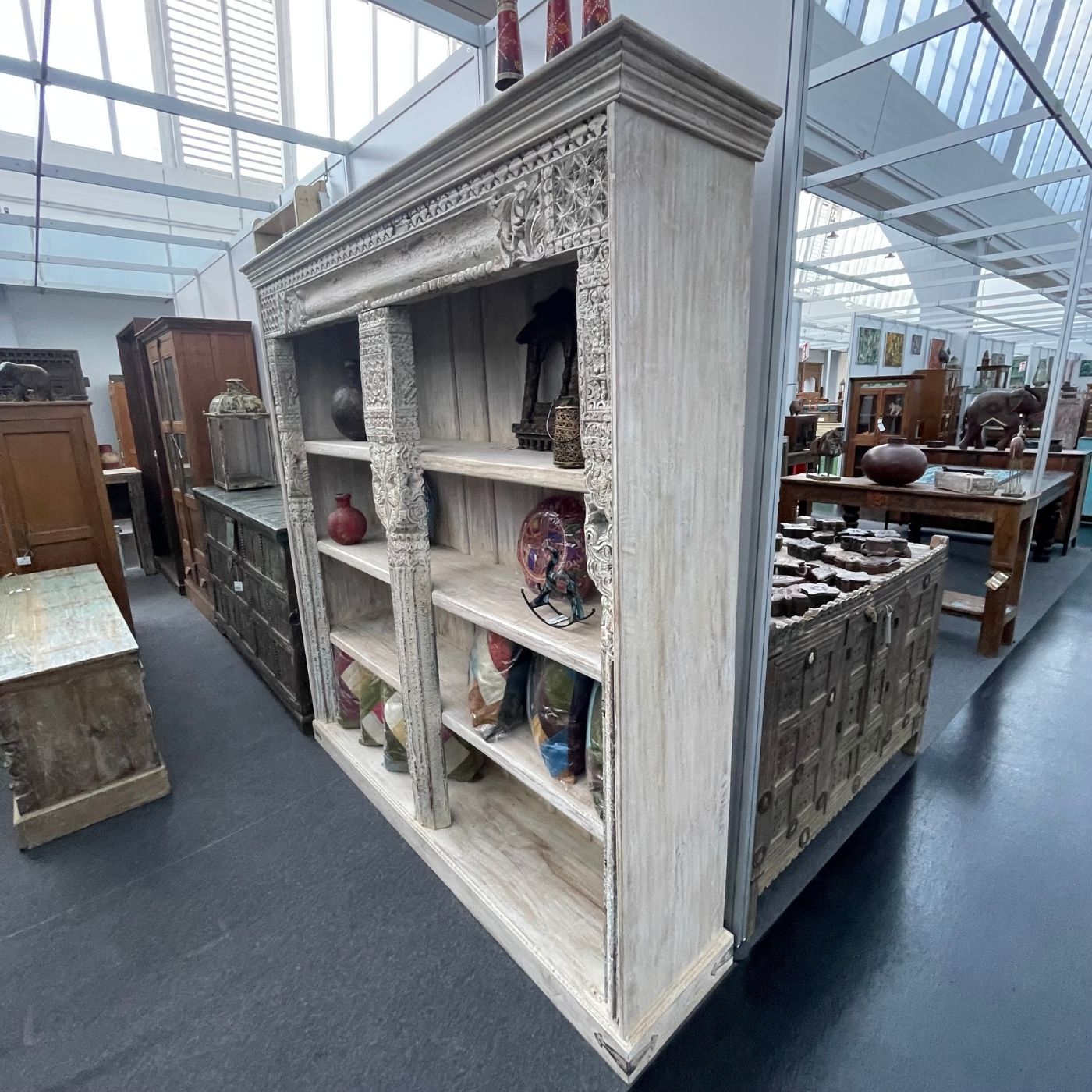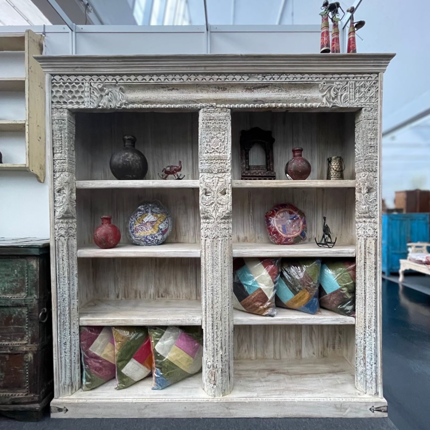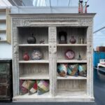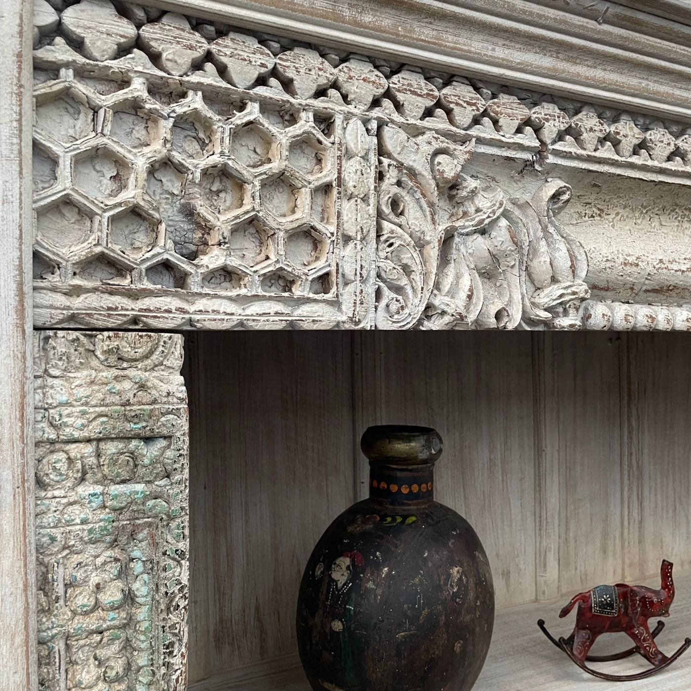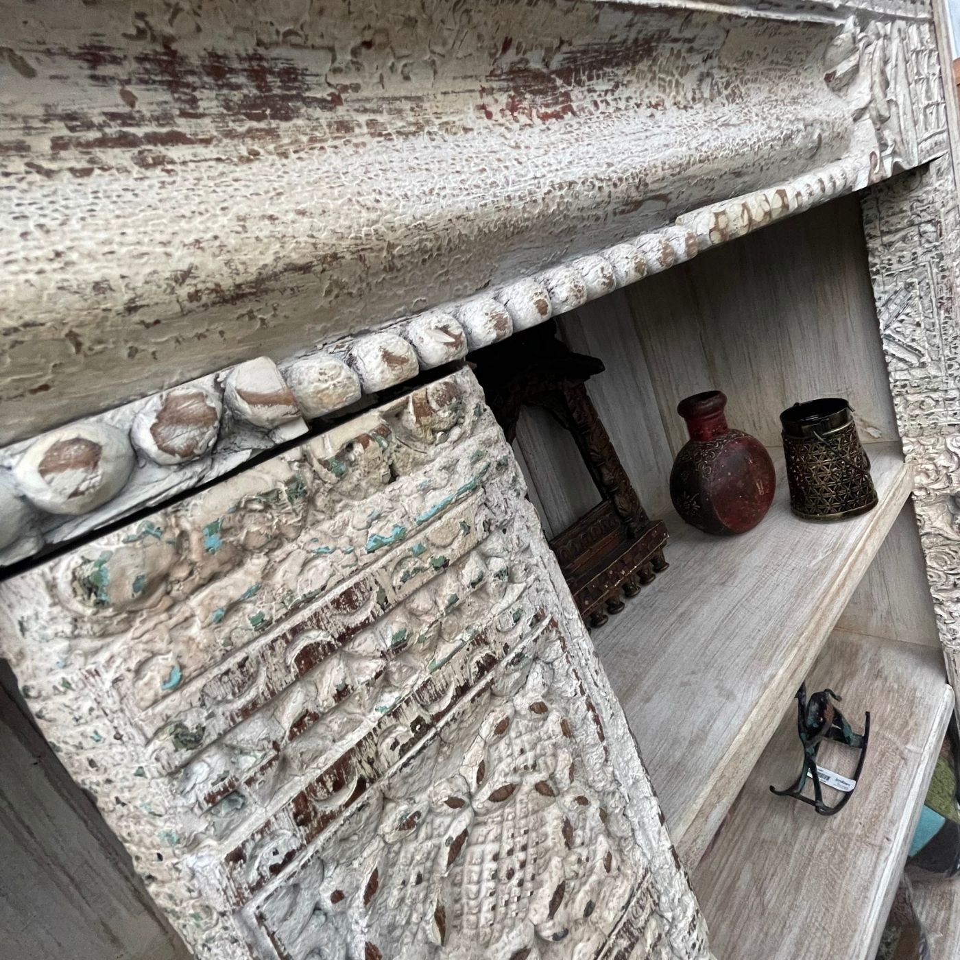 Dieses außergewöhnliche Regal beeindruckt durch seine kunstvoll geschnitzten Säulen und den hellen, leicht verwitterten Look.