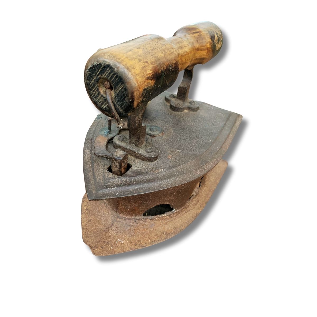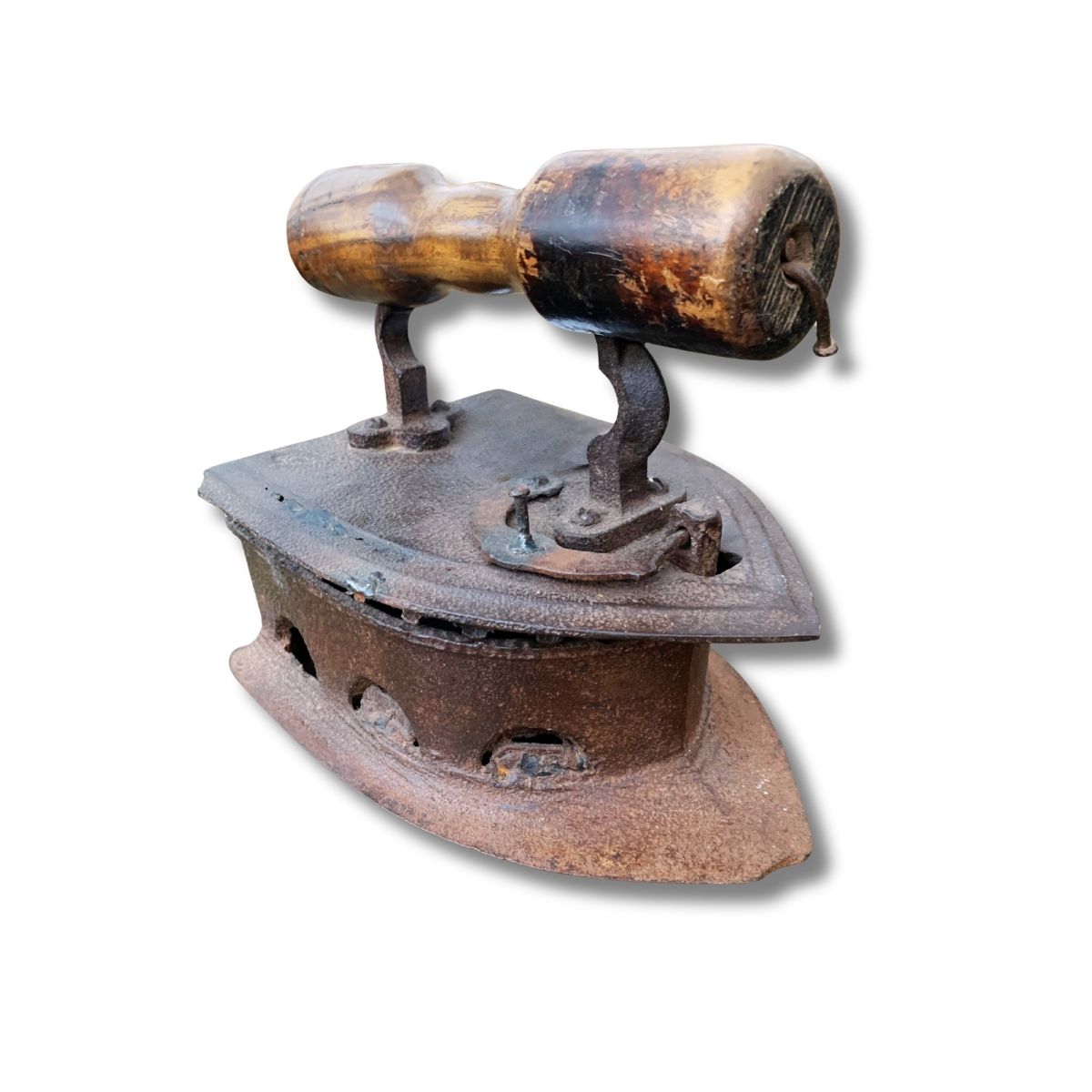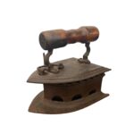 Dieses antike Bügeleisen aus massivem Gusseisen mit Holzgriff ist ein Stück echter Handwerksgeschichte.