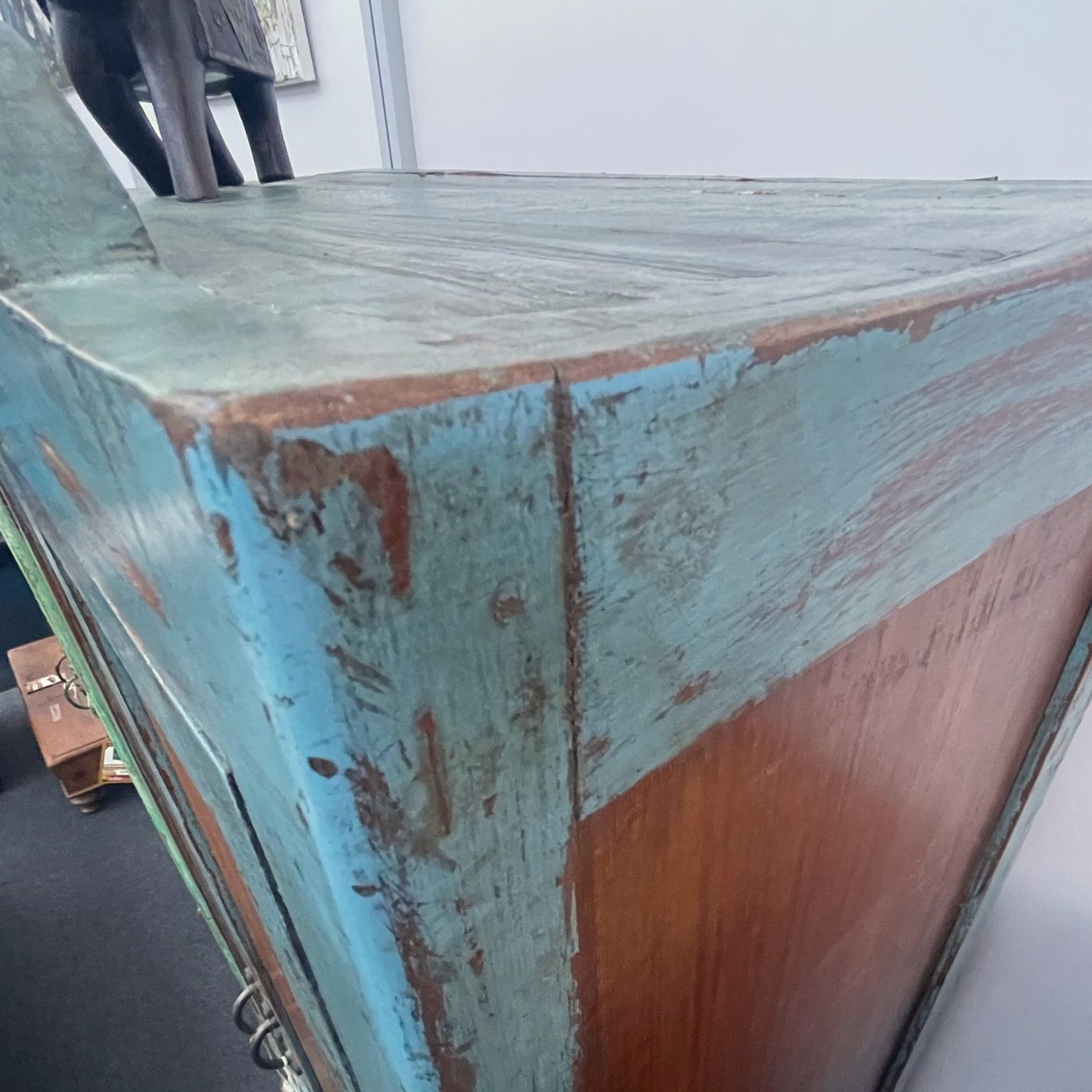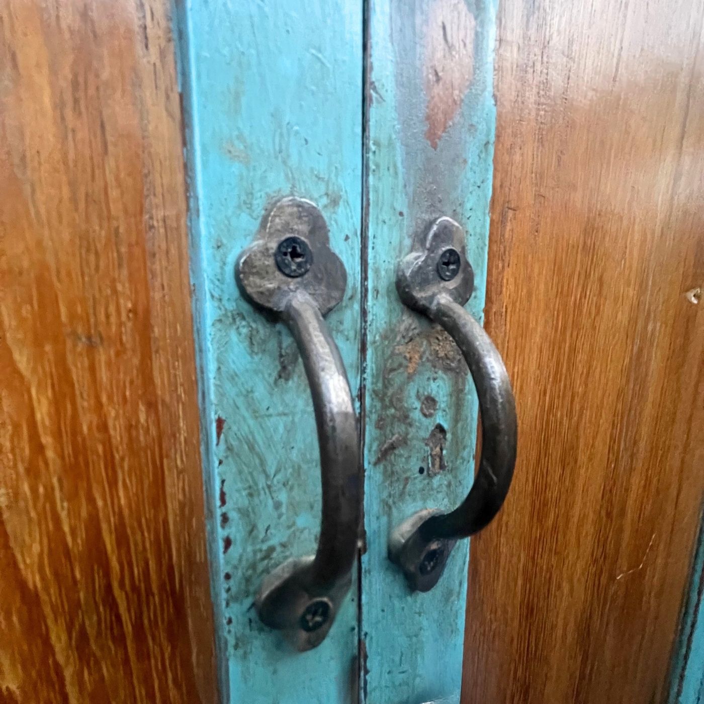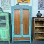 Ein zeitlos schöner Schrank aus massivem Holz, dessen blauer Rahmen und naturfarbene Türen einen spannenden, doch ausgewogenen Kontrast bilden.