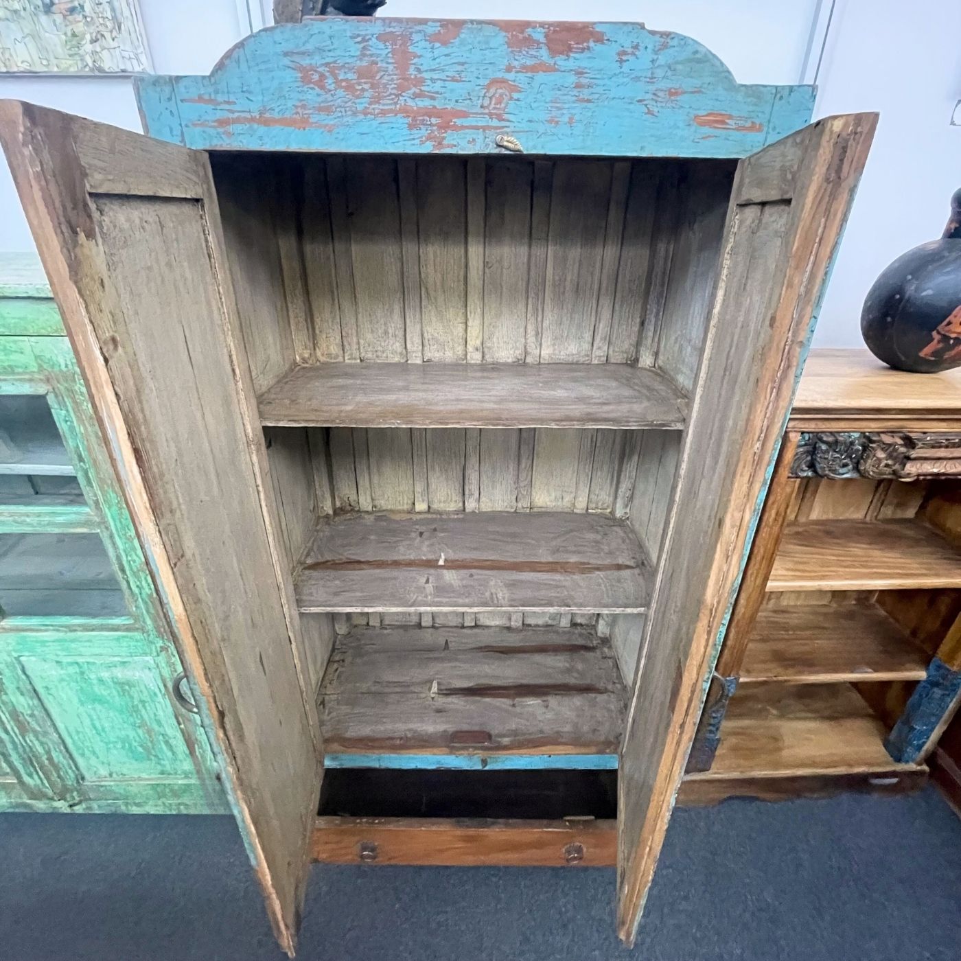 Im Inneren bietet der Schrank mehrere Einlegeböden und unten eine praktische Schublade – ideal für Kleidung, Geschirr oder persönliche Schätze.