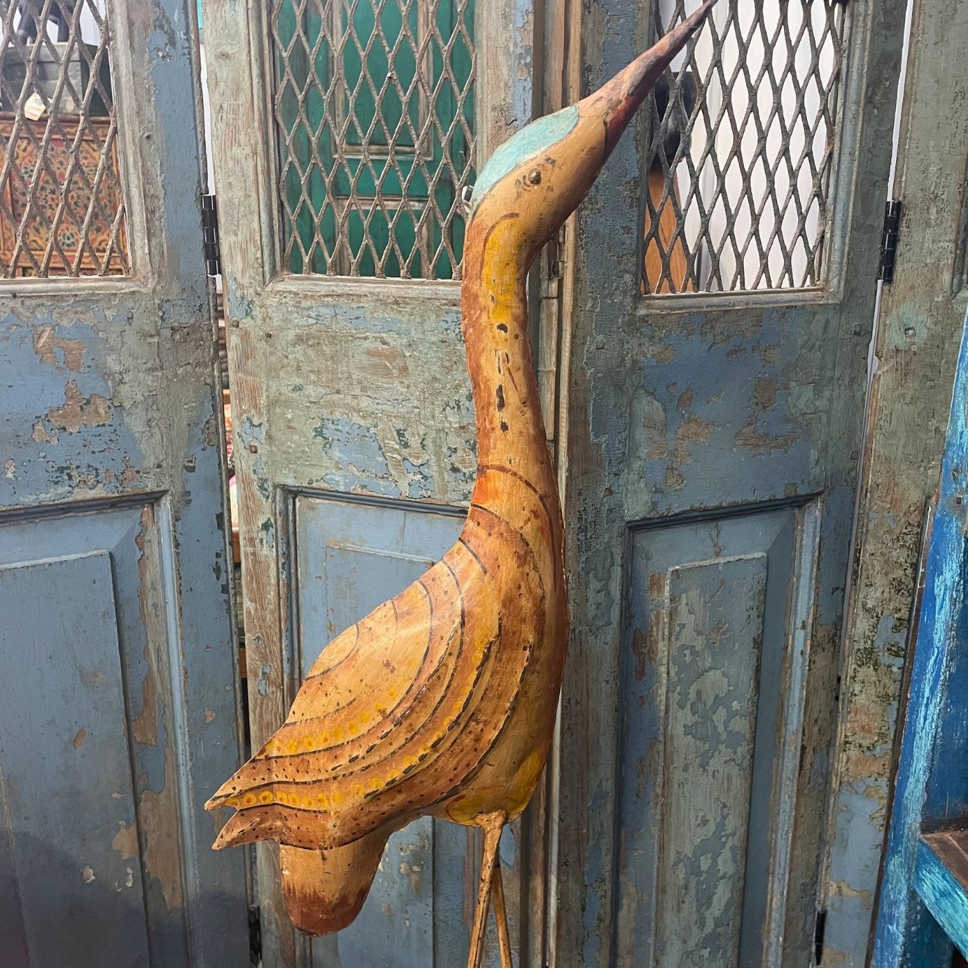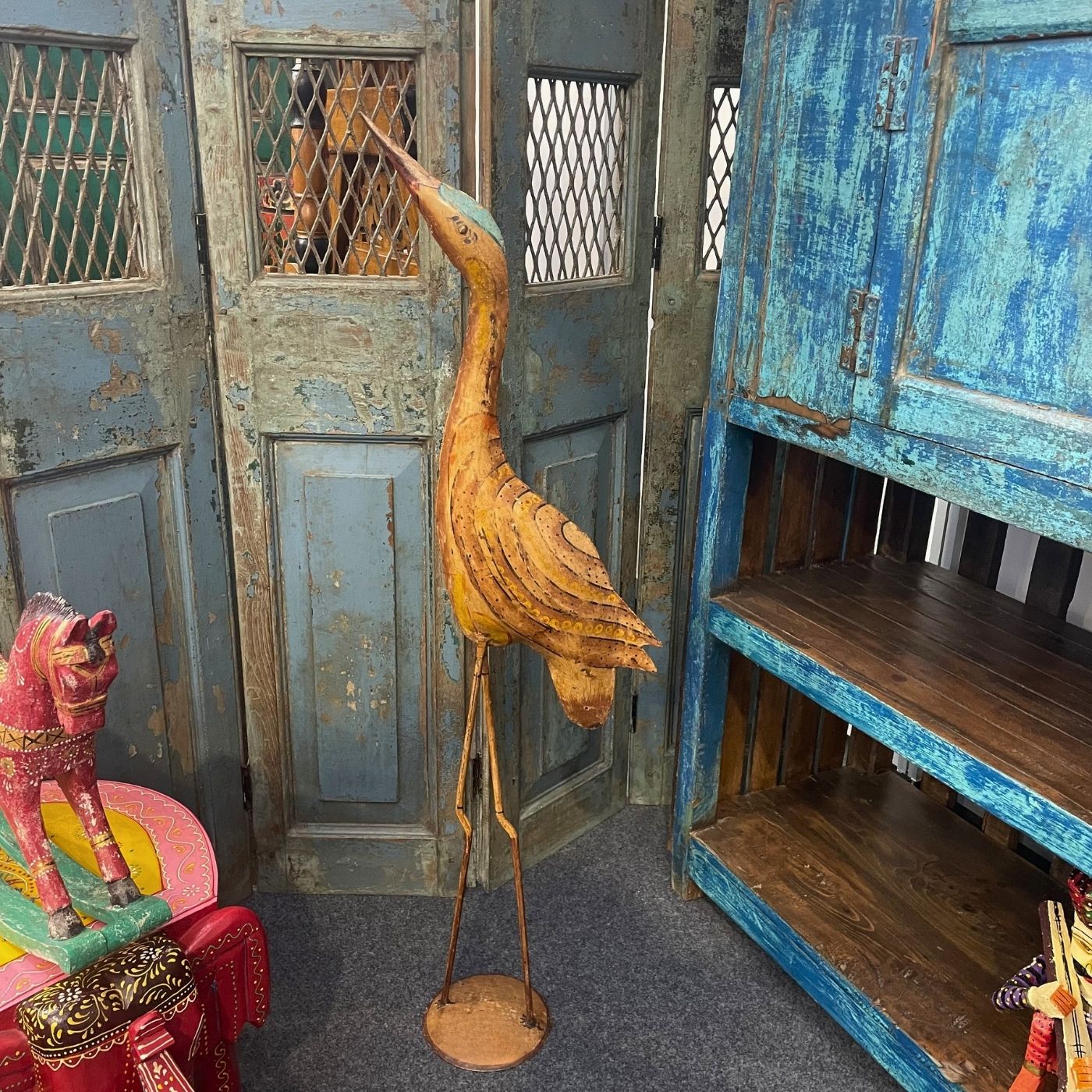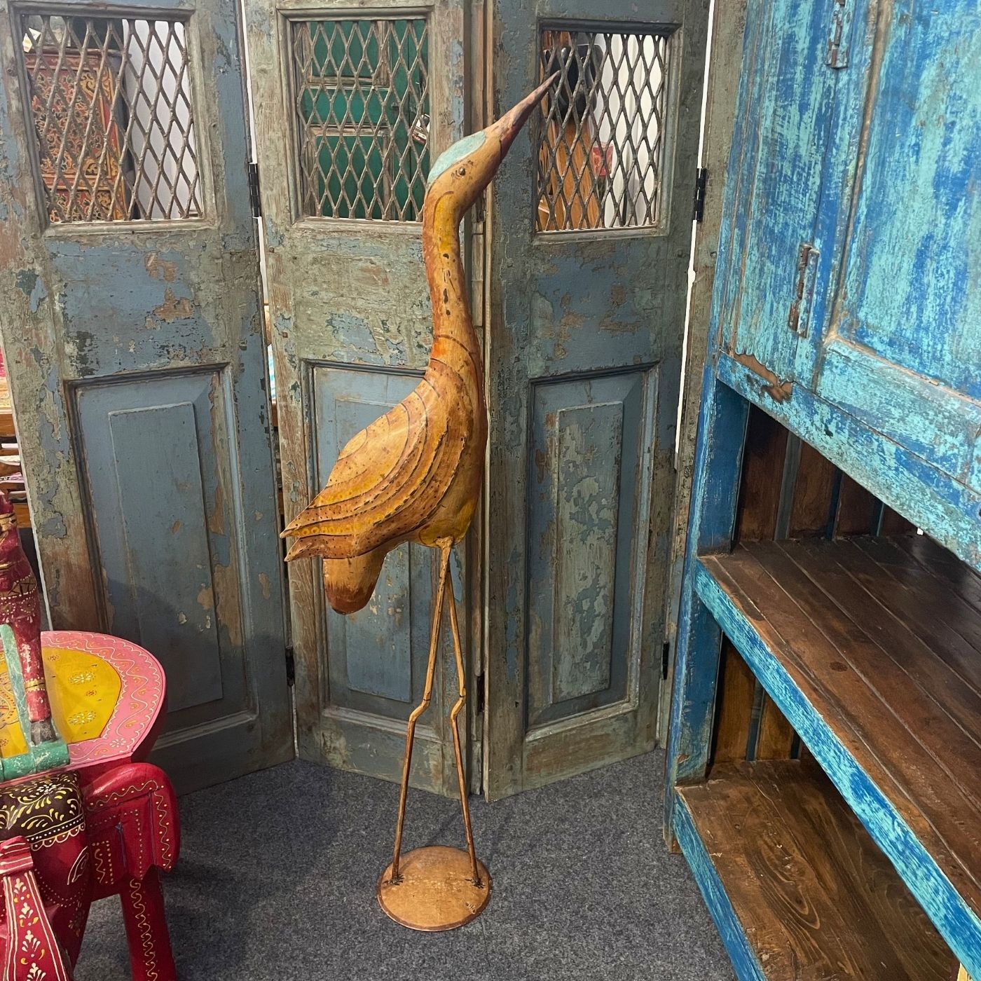 Diese elegante Kranichstatue aus Eisen ist ein echter Blickfang für Ihr Zuhause. Die schlanke, kunstvolle Form und die rustikale Vintage-Patina verleihen jedem Raum eine besondere, stilvolle Atmosphäre. Ob im Wohnzimmer, Flur oder in Geschäftsräumen – diese handgefertigte Figur bringt Natürlichkeit und Charakter in Ihre Einrichtung und setzt dekorative Akzente mit einzigartigem Charme.