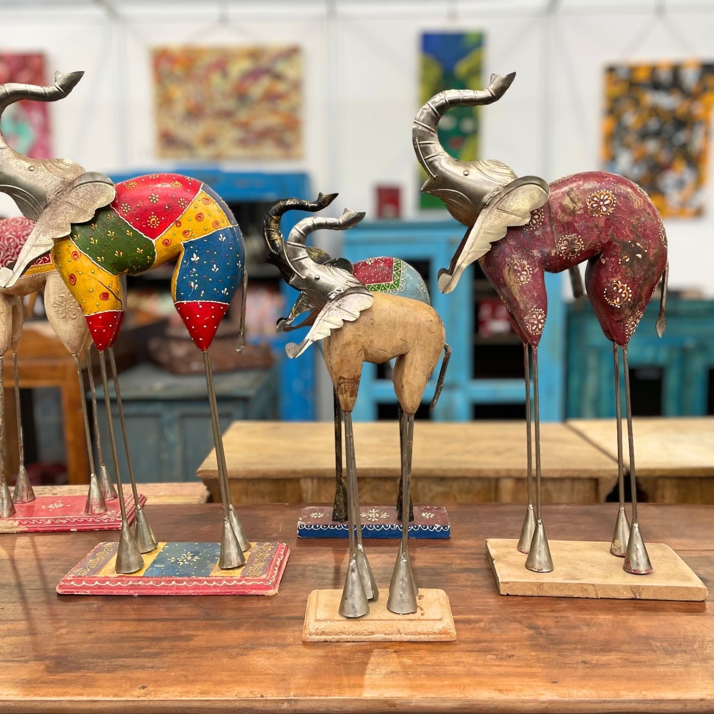 Diese außergewöhnlichen Elefantenfiguren sind echte Hingucker mit humorvollem Charakter. Der Elefant steht auf langen, schlanken Metallbeinen und wirkt dadurch leicht, verspielt und fast schwebend. Der farbig gestaltete Körper in Kombination mit dem metallischen Kopf verleiht der Figur einen spannenden Material- und Stilkontrast.