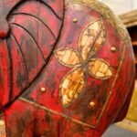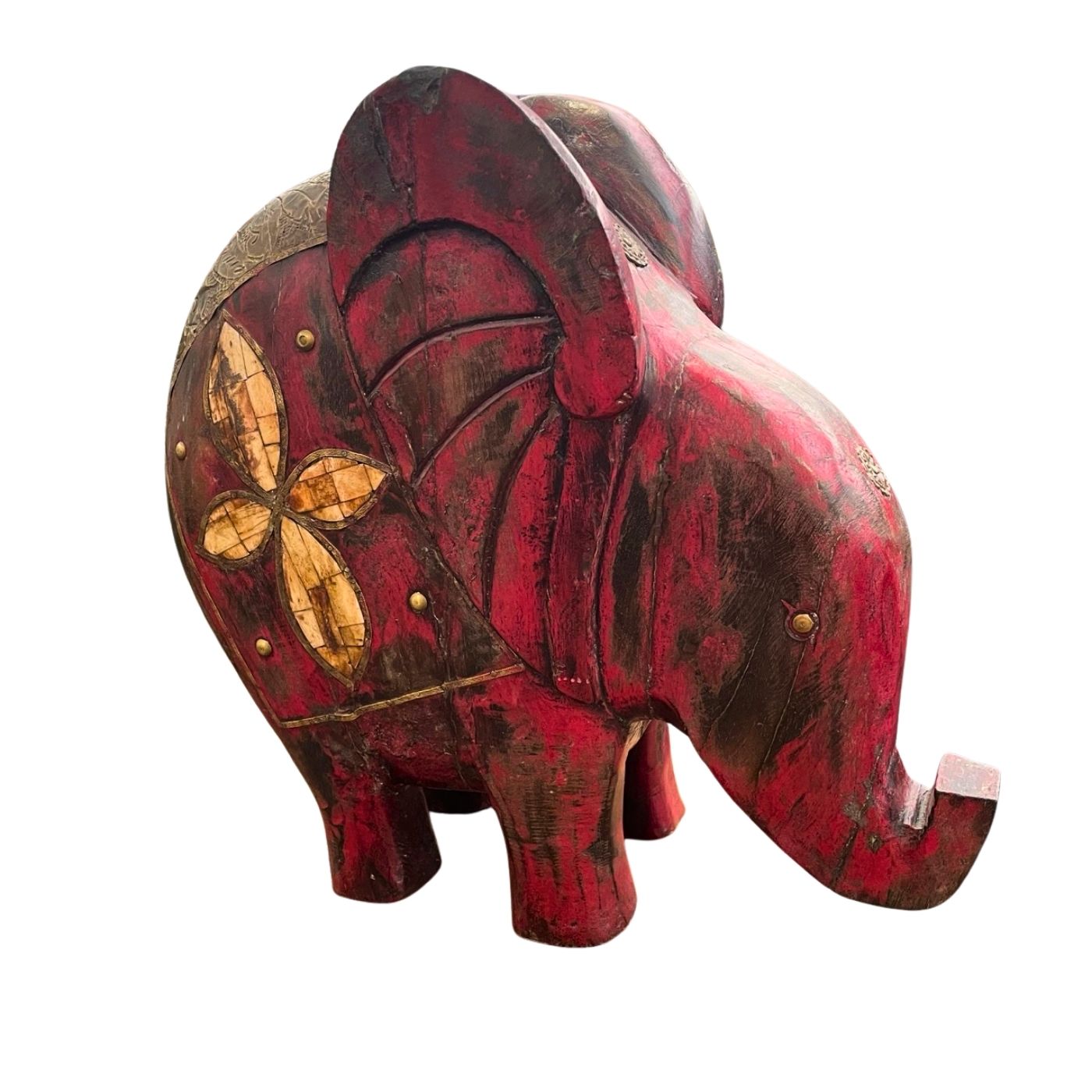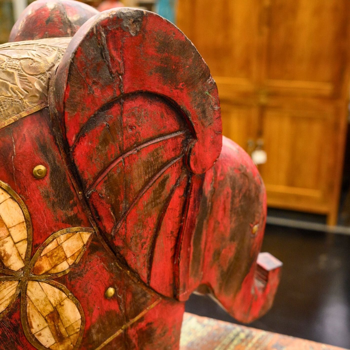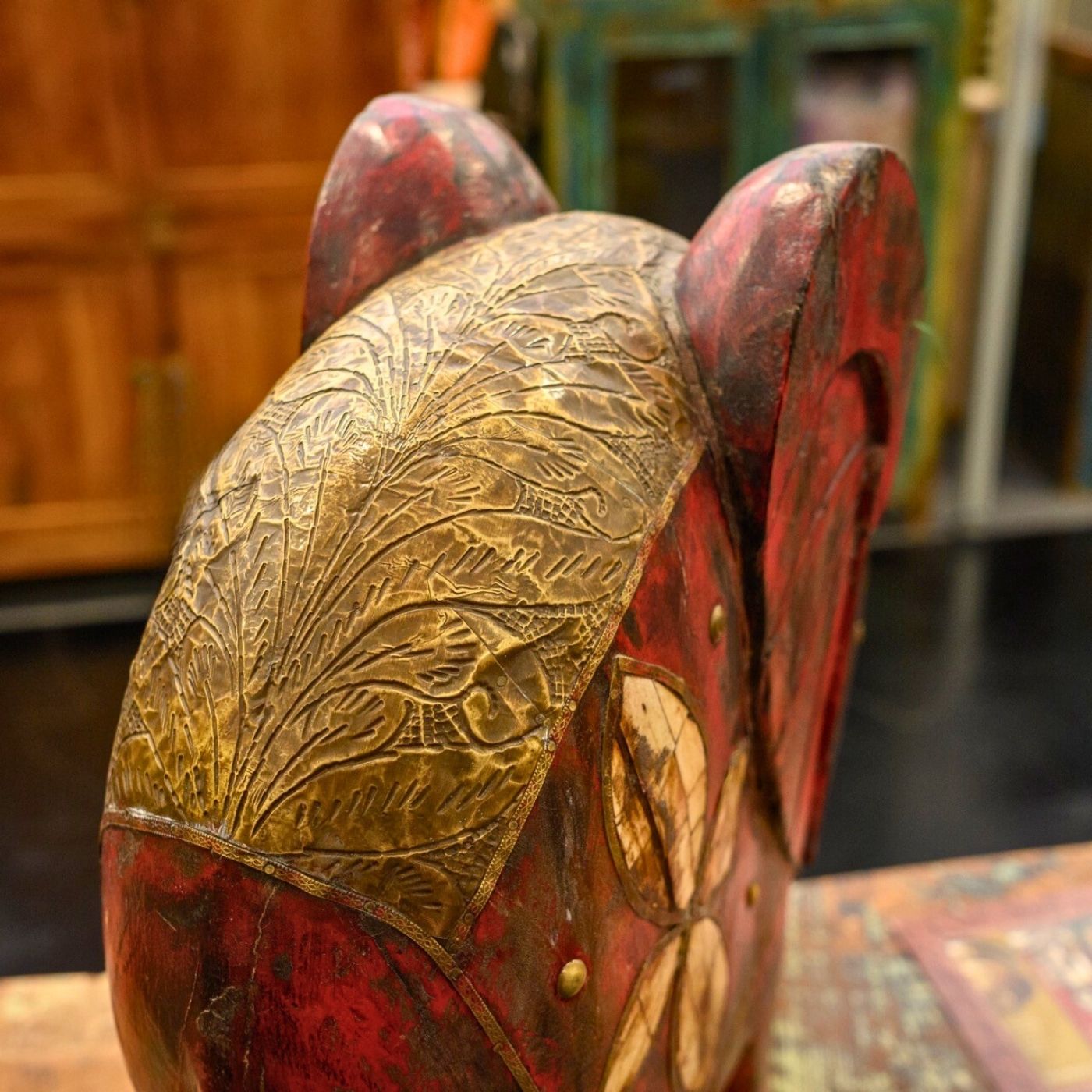 Indische Elefantenfigur aus Holz mit handgearbeiteten Schnitzdetails und dekorativen metallischen Elementen. Die farbige Oberfläche verleiht der Figur eine ausdrucksstarke Präsenz und macht sie zu einem besonderen Dekoobjekt.
