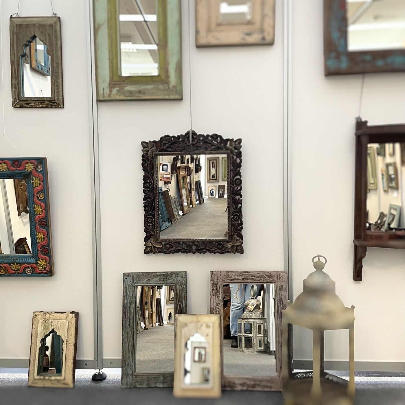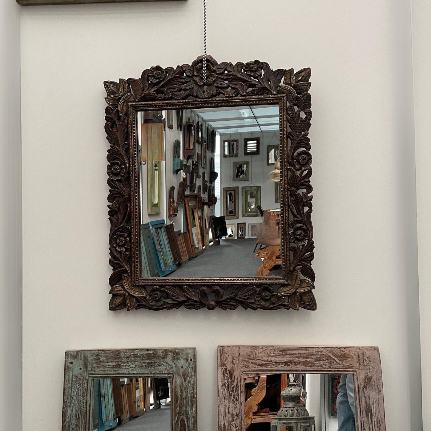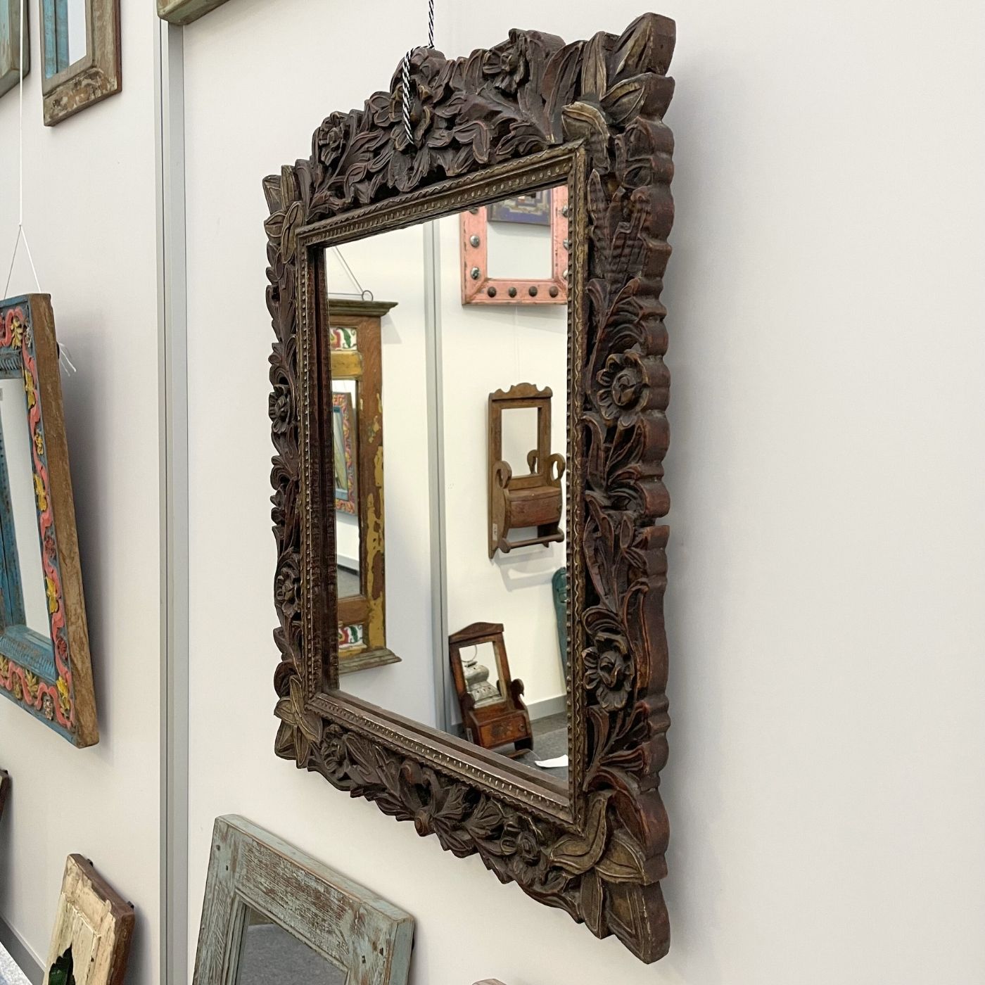 Ein Spiegel, der mehr ist als nur ein Alltagsgegenstand – dieses handgeschnitzte Schmuckstück aus Indien verleiht jedem Raum Charakter und Tiefe.