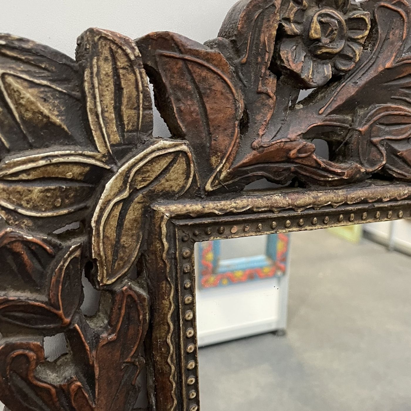 Der reich verzierte Rahmen aus massivem Holz zeigt kunstvolle florale Schnitzereien, die in liebevoller Handarbeit gefertigt wurden.