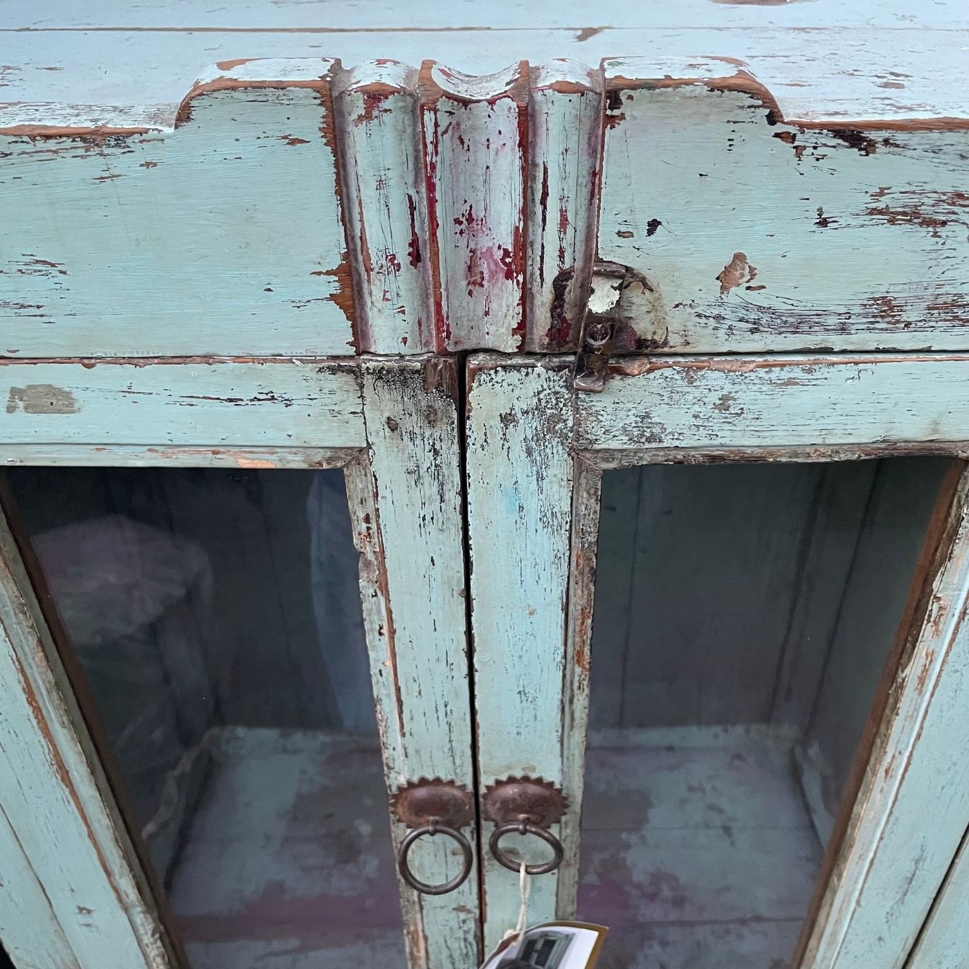 Hinter den kleinen Glastüren lässt sich Platz für persönliche Schätze, Kerzen oder Figuren finden – ein Möbelstück, das Ruhe und Geschichte ausstrahlt.