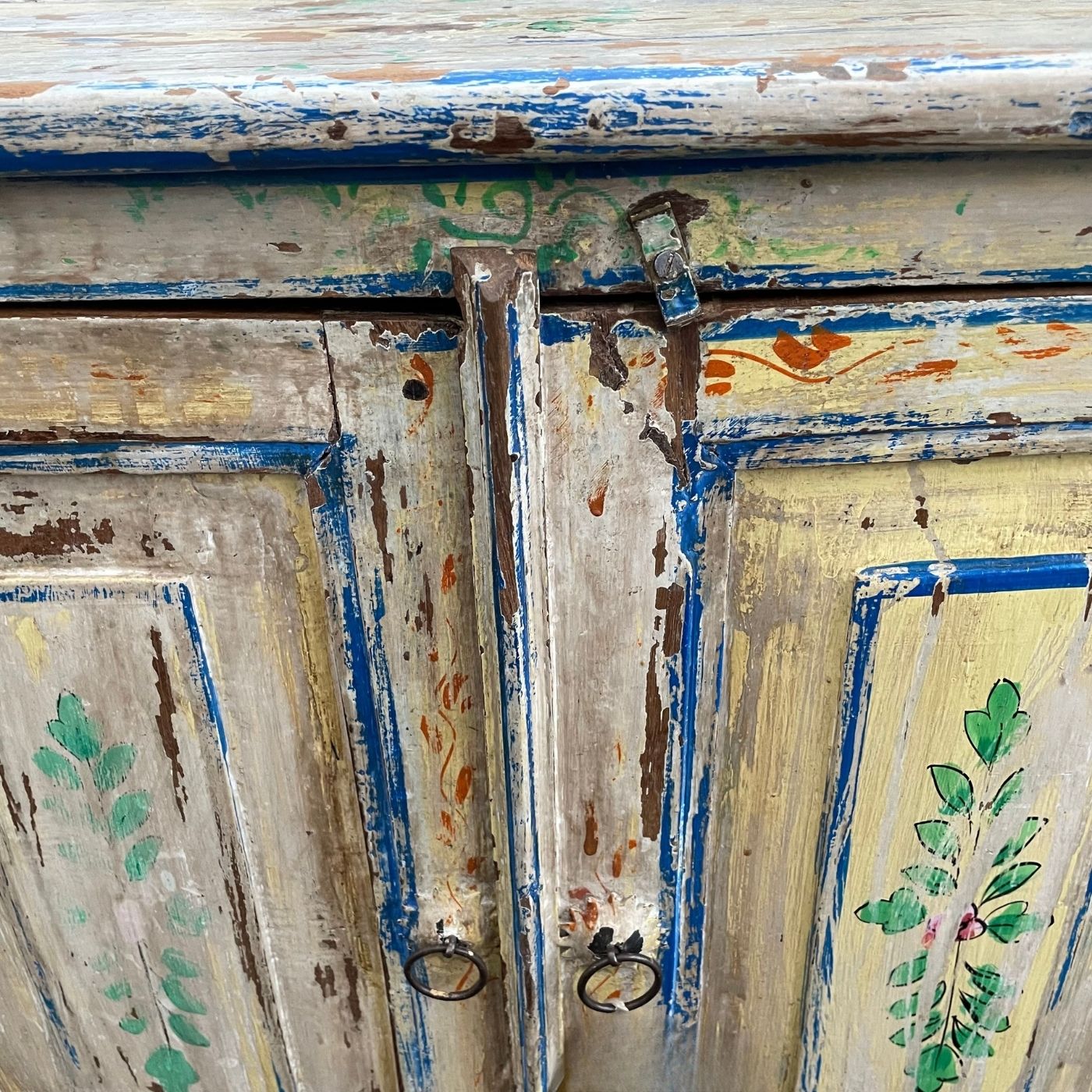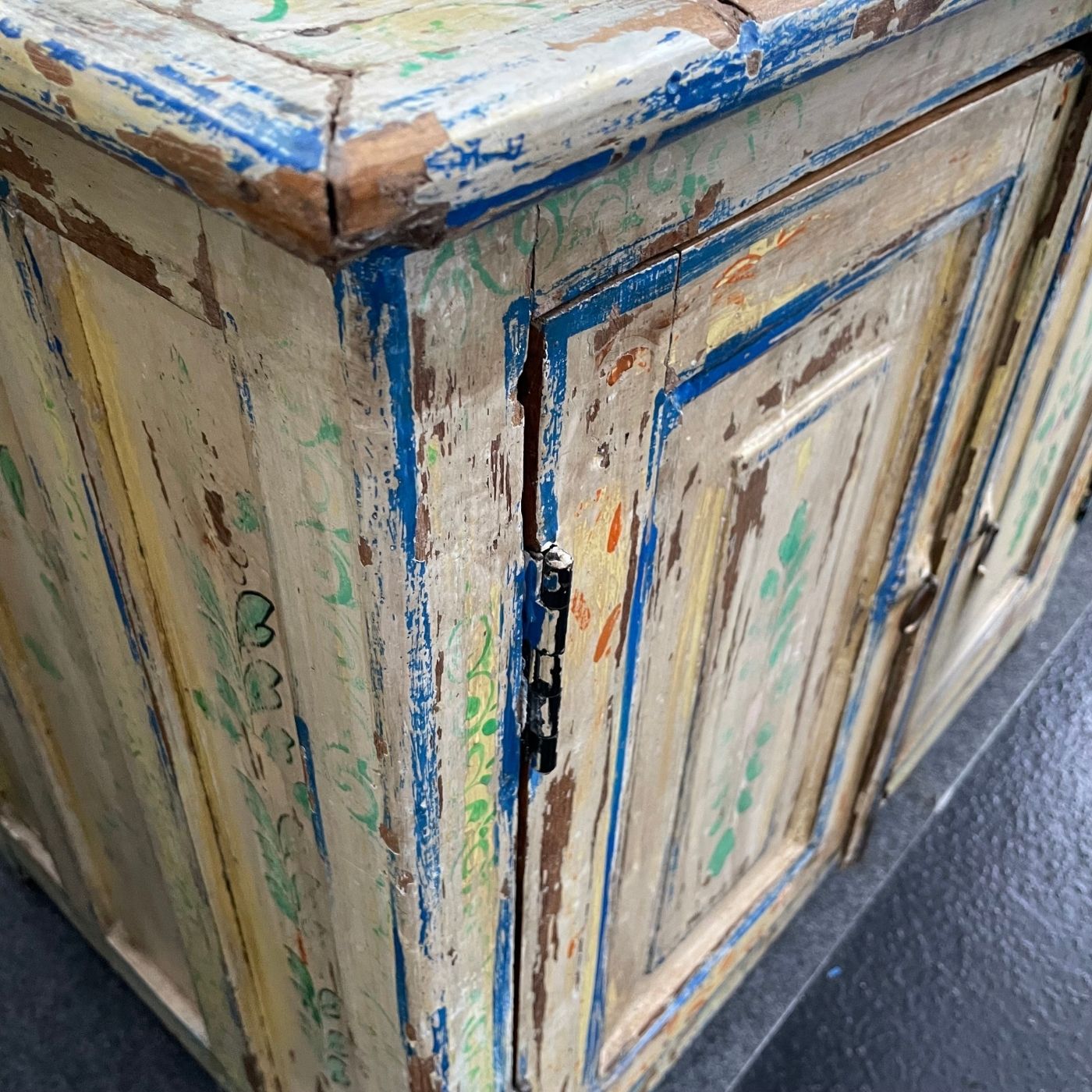Die kunstvollen floralen Muster und die sanft abgenutzte Oberfläche verleihen dem Möbelstück einen unverwechselbaren Vintage-Charme.