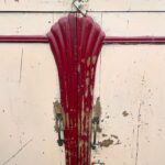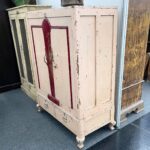 Ein außergewöhnlicher Holzschrank, der mit seiner rot-weißen Patina und den dezenten Gebrauchsspuren sofort die Blicke auf sich zieht.