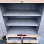 Im Inneren überrascht der Schrank mit einer zart graulila Farbgebung, die dem Möbelstück eine geheimnisvolle, fast poetische Tiefe verleiht.