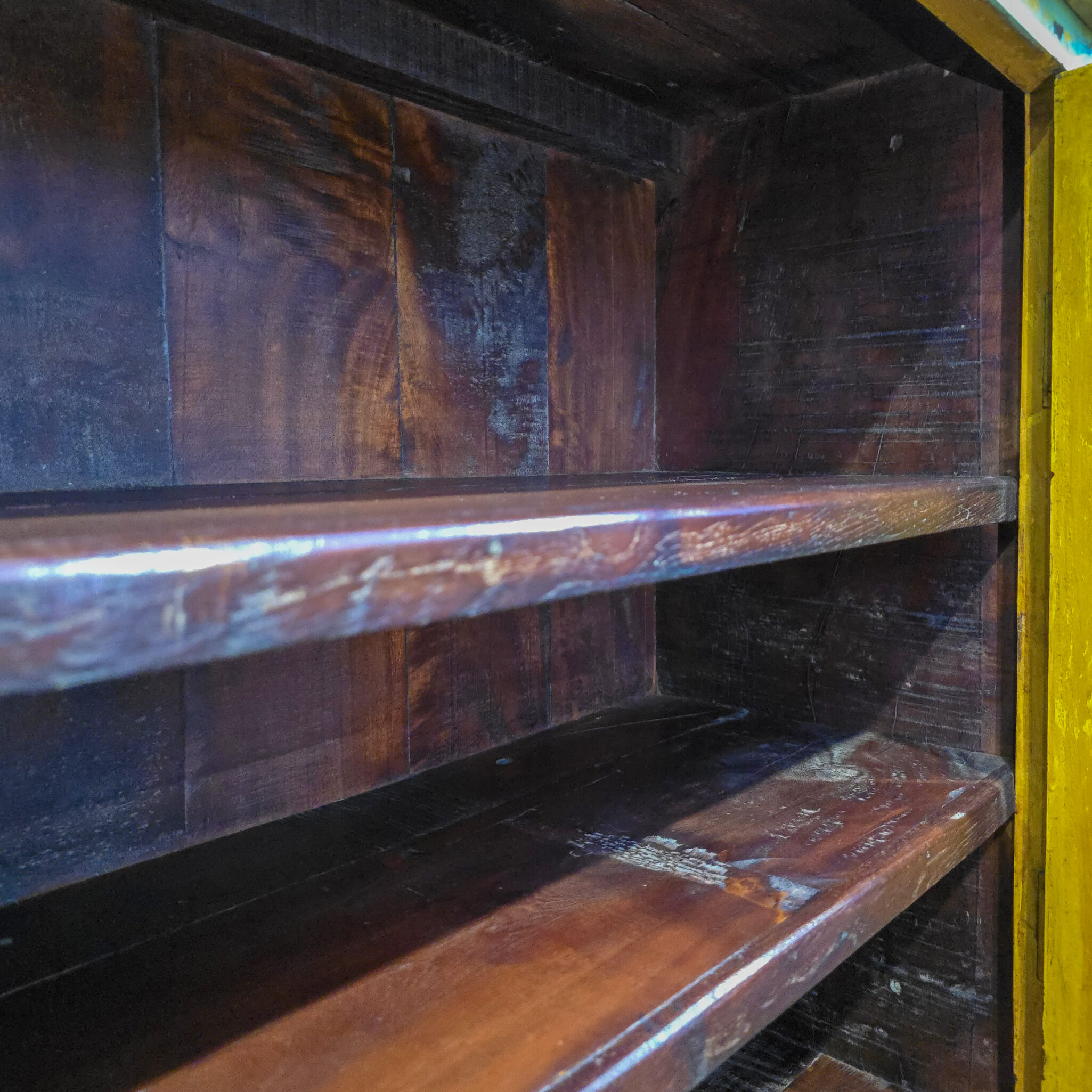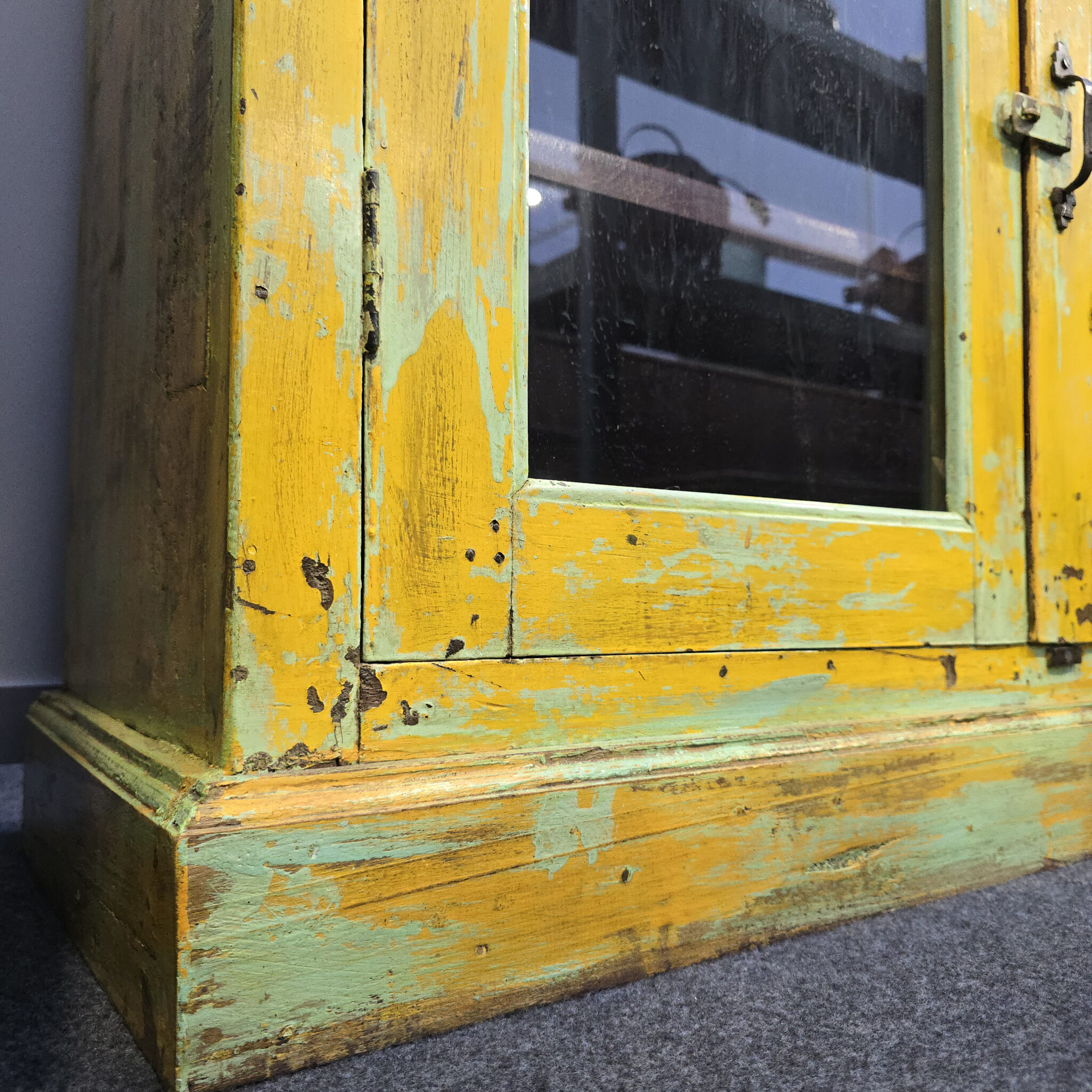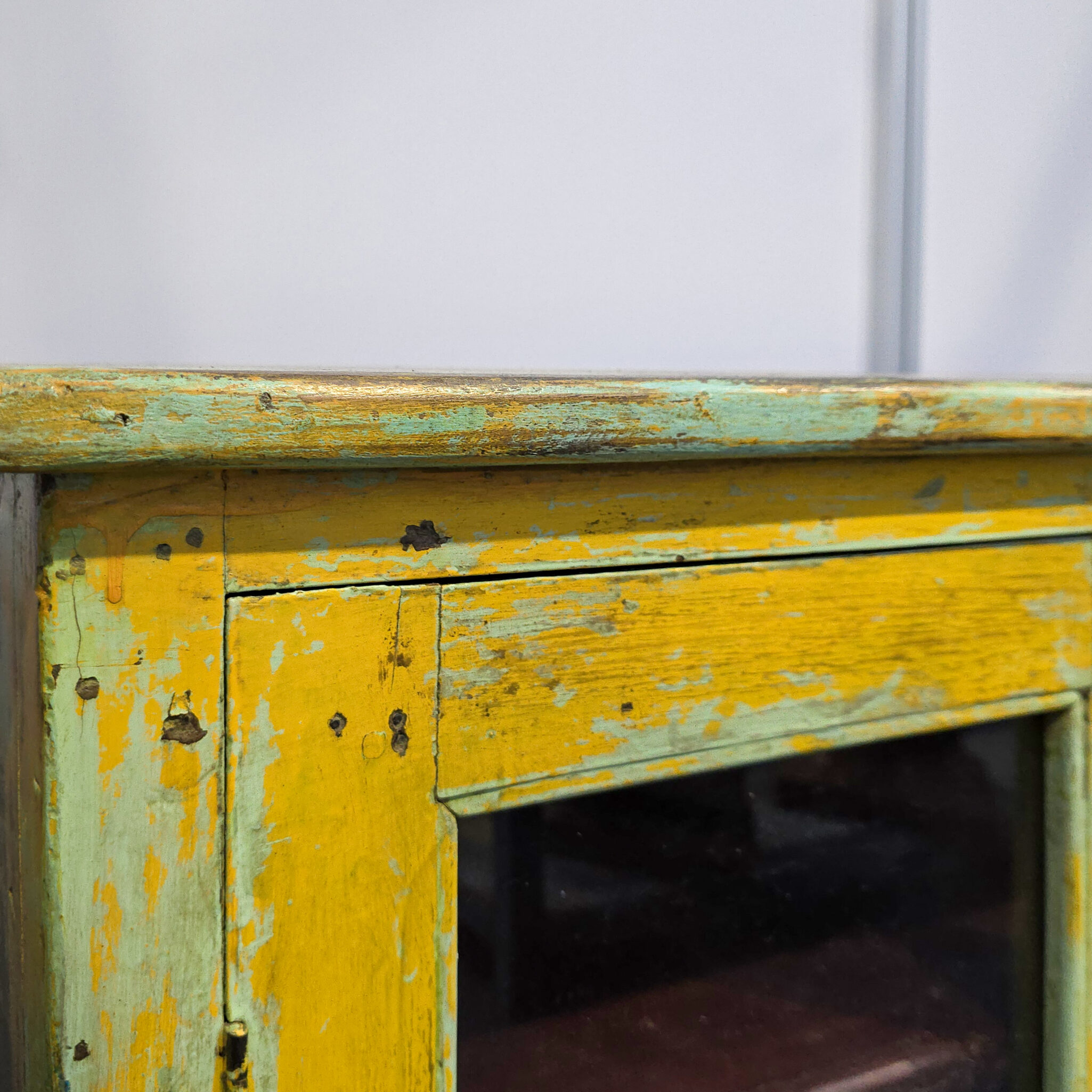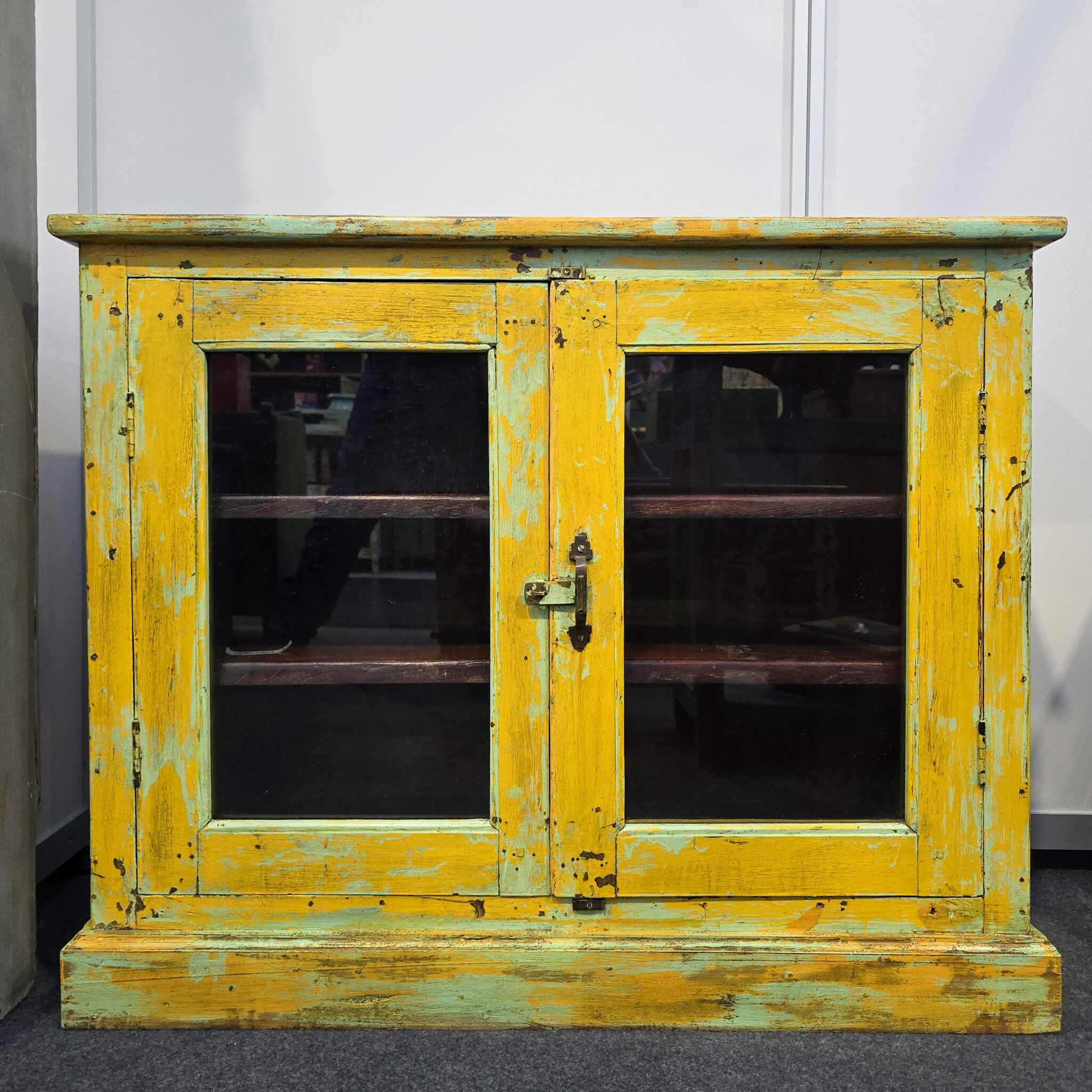 Das Kästchen besticht durch seine leuchtende gelbe Farbgebung und bringt sofort Wärme in jeden Raum. Jedes Stück wird aus massivem Holz gefertigt, was eine beeindruckende Robustheit garantiert. Zudem sorgt die bewusste Gestaltung im Vintage-Stil für eine unverwechselbare nostalgische Note. Die Oberfläche weist charmante Gebrauchsspuren auf, welche die lange Geschichte dieses Möbels unterstreichen. Deshalb ist jedes Kästchen ein echtes Unikat mit eigenem Charakter. Das Design fügt sich harmonisch in moderne sowie klassische Einrichtungsstile ein. Somit setzen Sie ein klares Statement für Individualität und handwerkliche Exzellenz. Darüber hinaus bietet das Möbelstück durch die Glastüren einen stilvollen Einblick in Ihr Inneres.