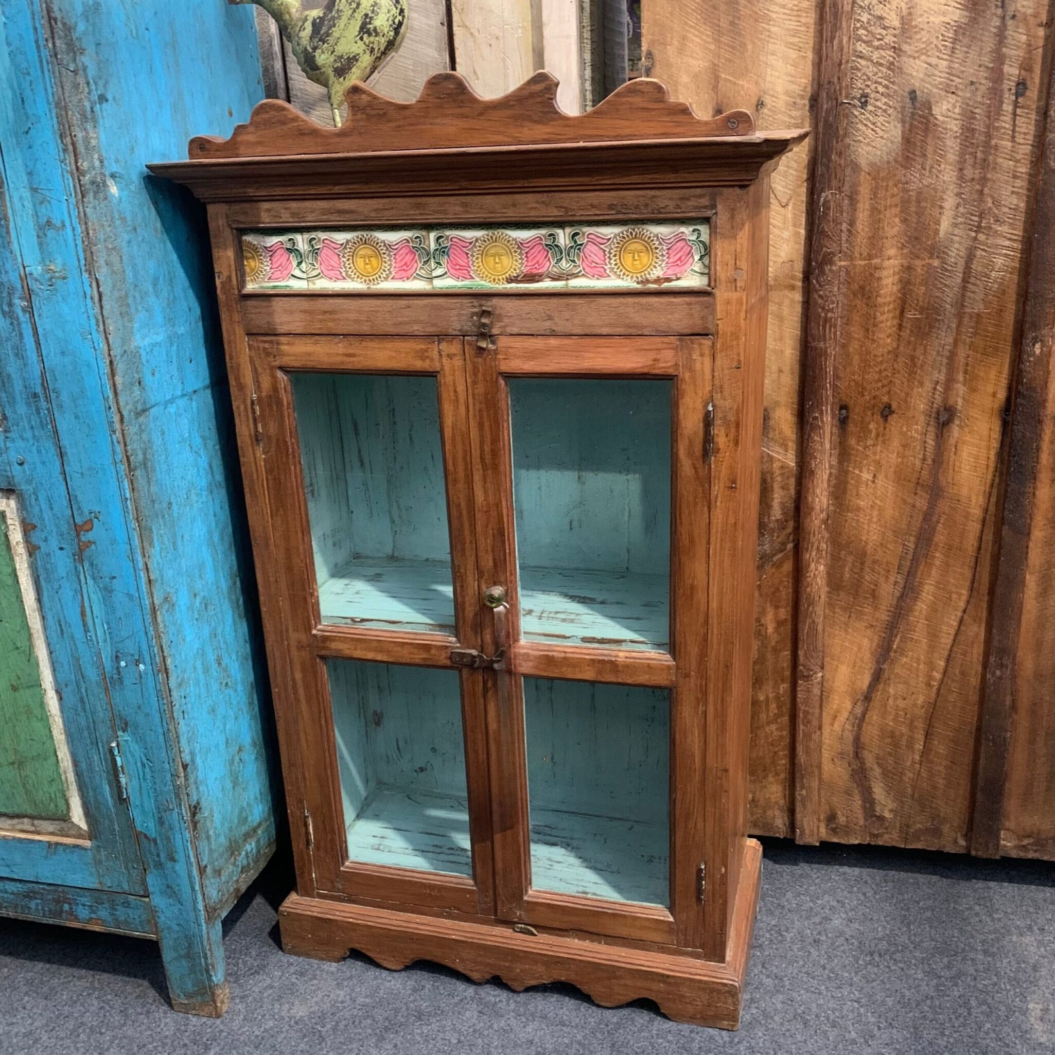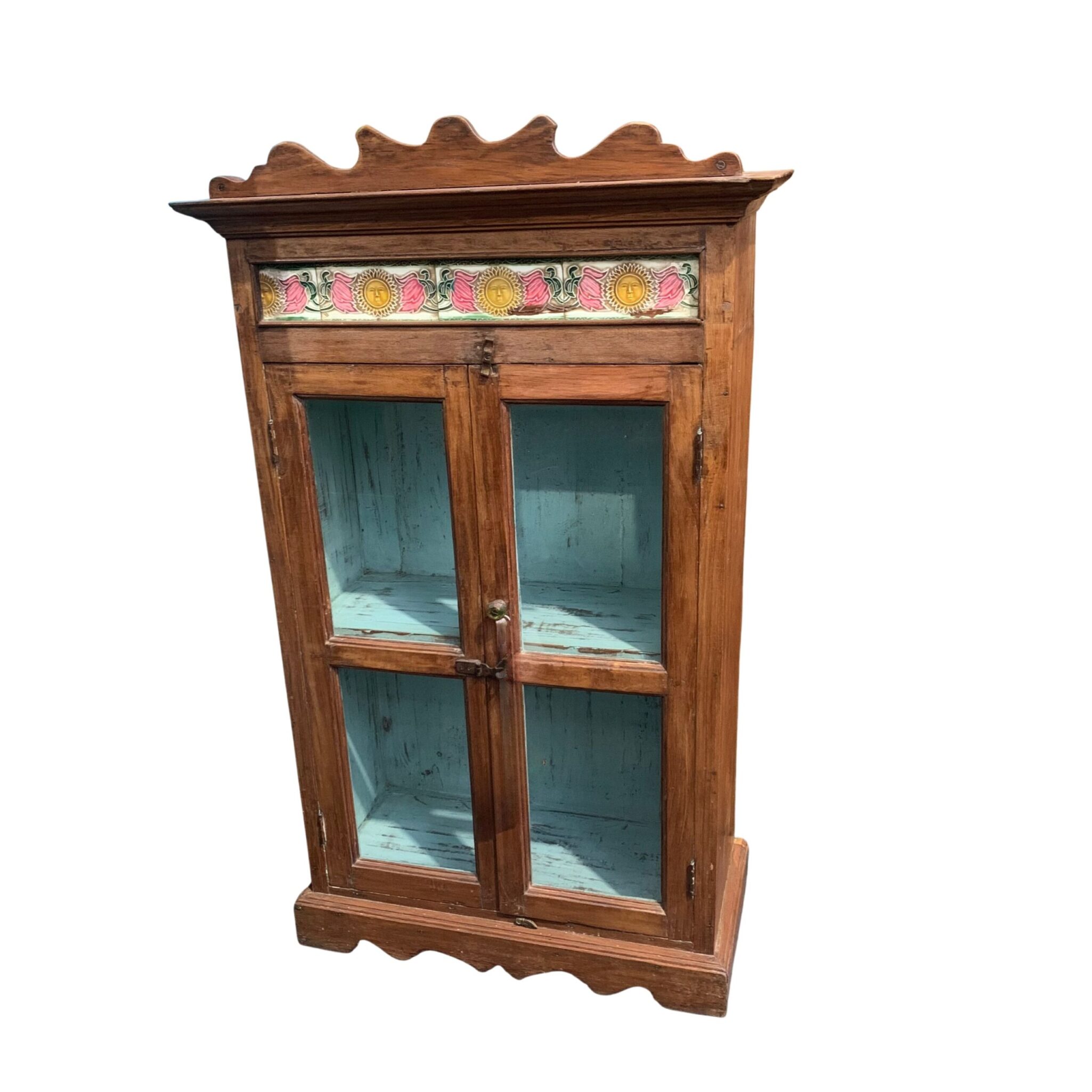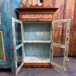 Die Glasfront mit zwei Türen ermöglicht einen freien Blick ins Innere, während die farbenfrohe, handbemalt wirkende Zierleiste dem Möbelstück eine verspielte Note verleiht.