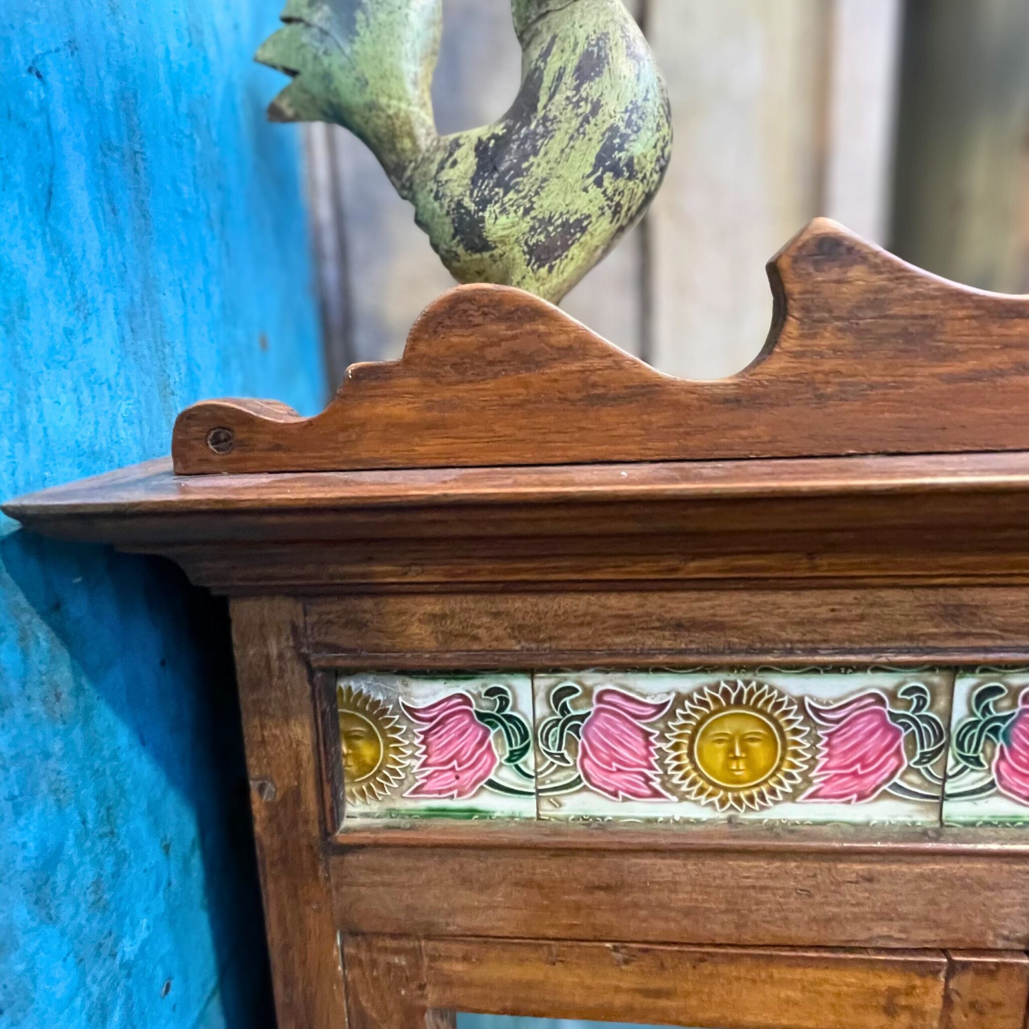 Innen in zartem Türkis gehalten, entsteht ein stimmiger Kontrast zum warmen Holzton des Rahmens.