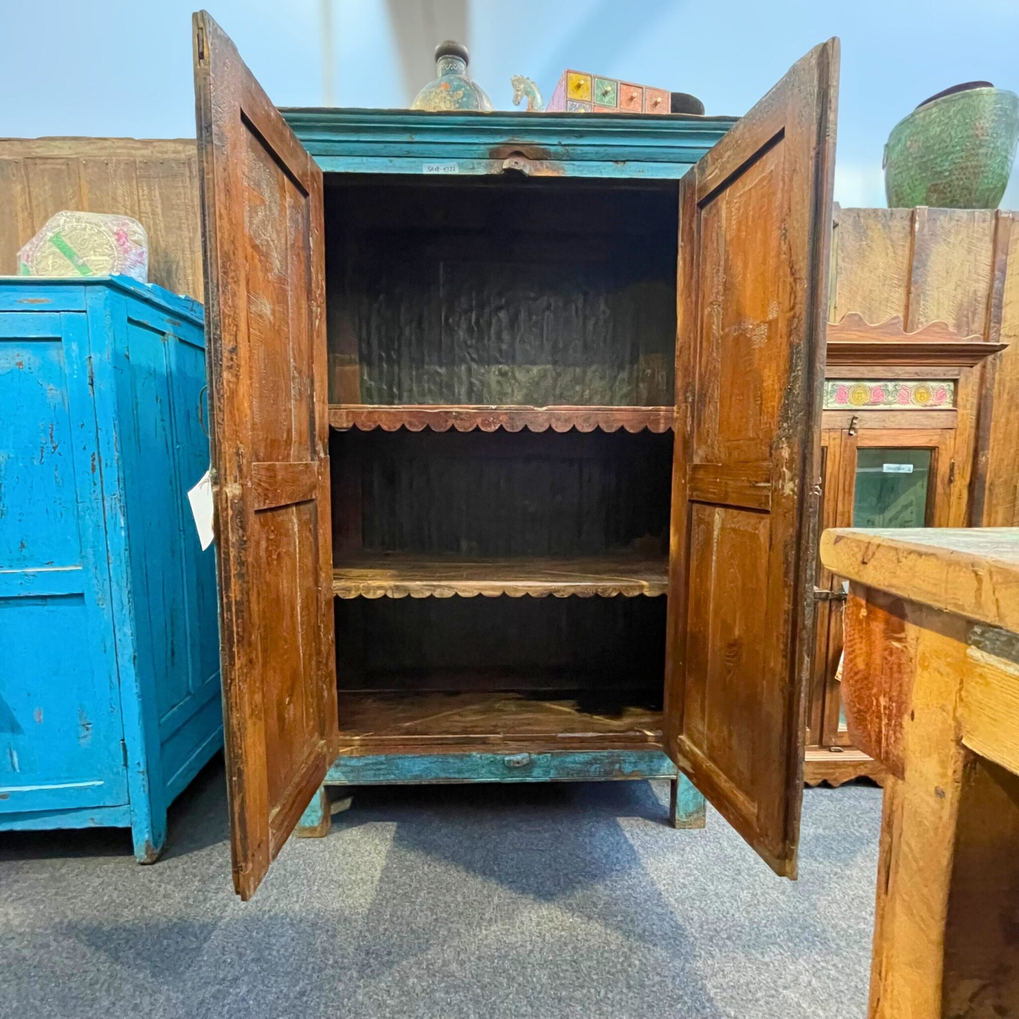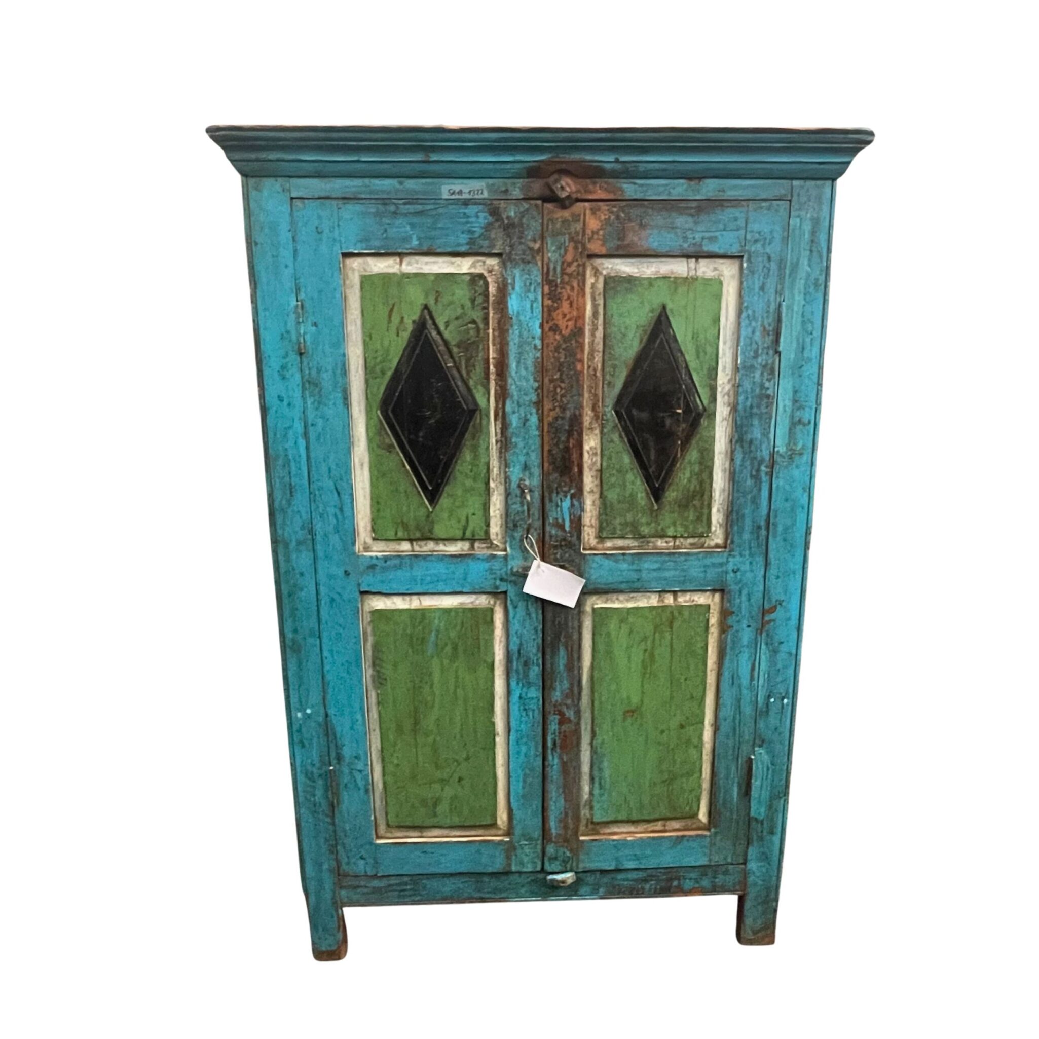 Dieser farbenprächtige Holzschrank aus Indien begeistert durch seine charaktervolle Kombination aus Blau und Grün.