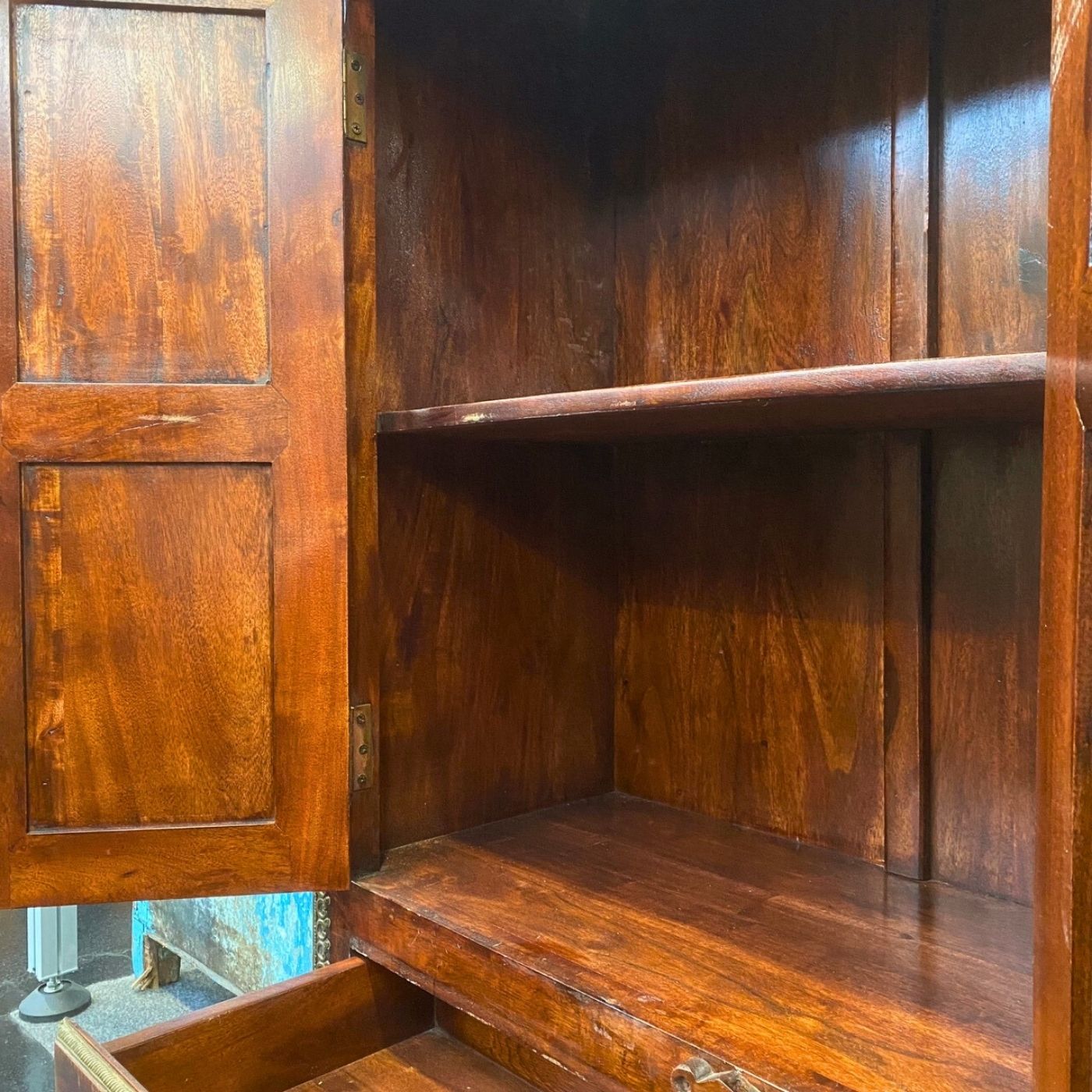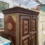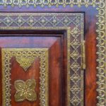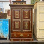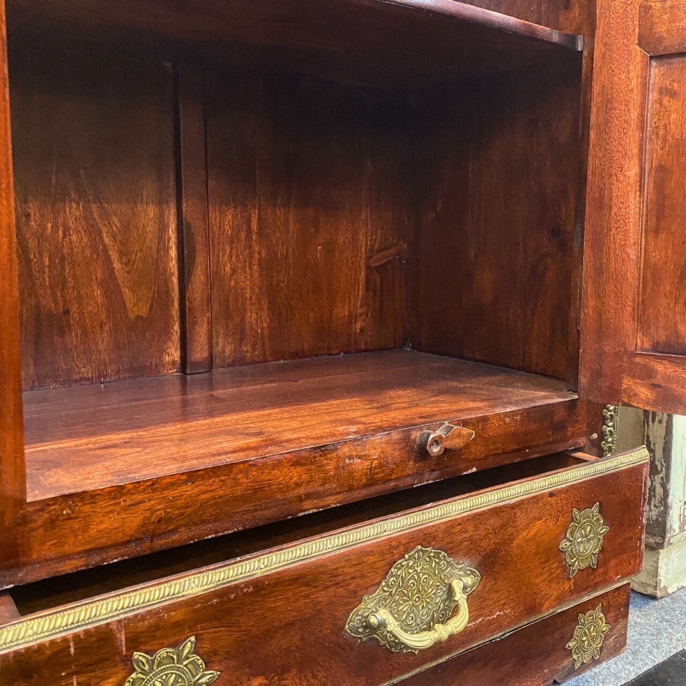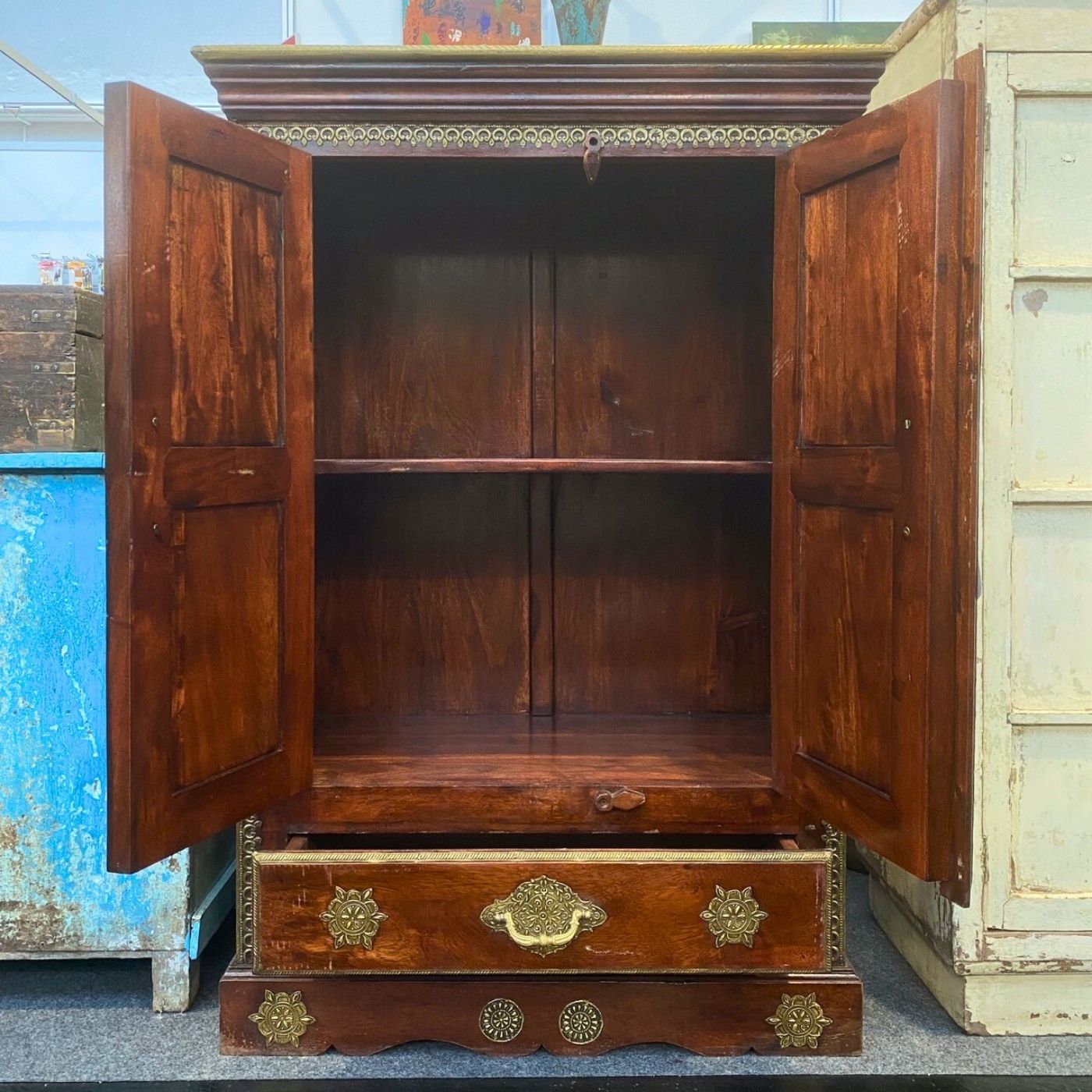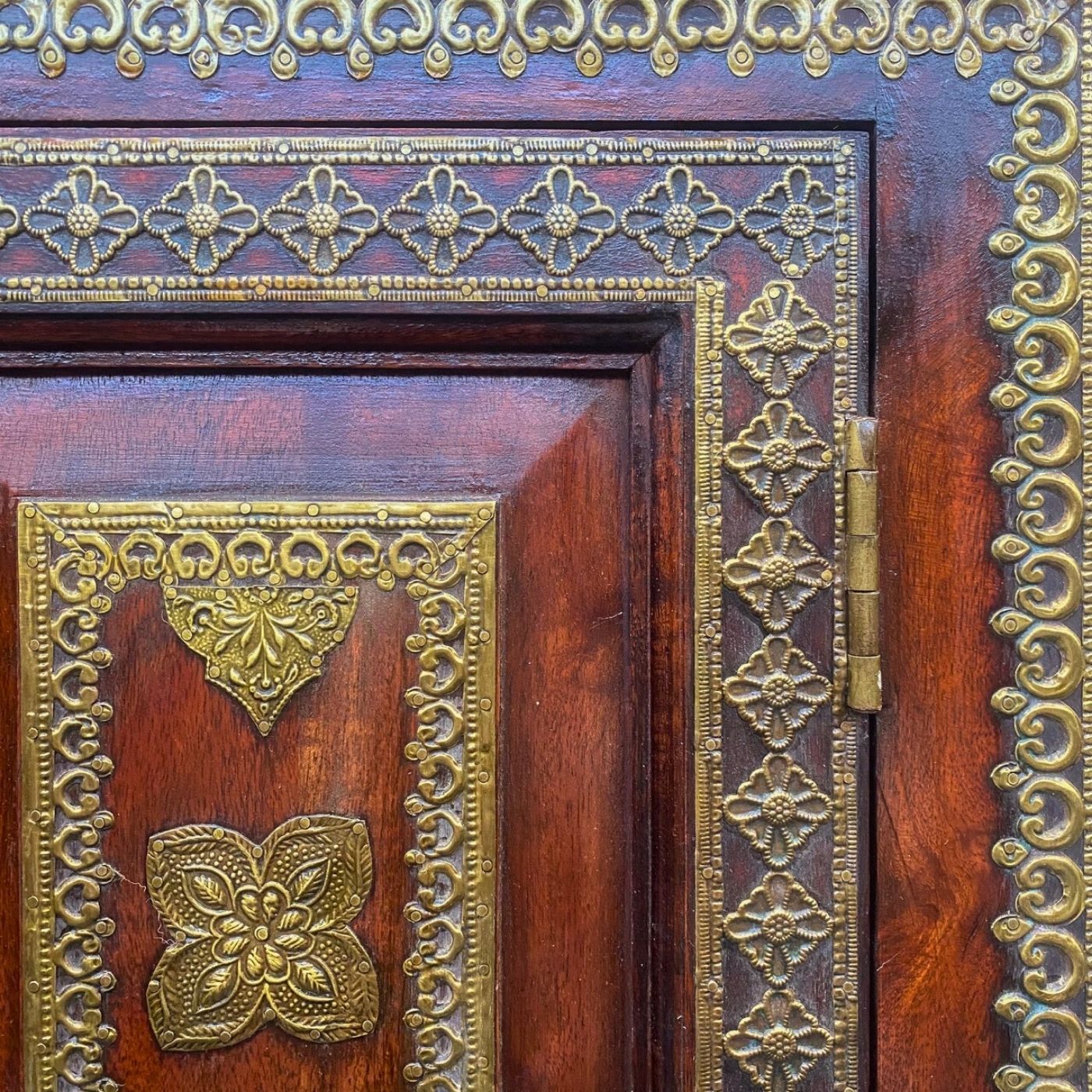 Dieser kunstvoll gestaltete Schrank aus massivem Holz besticht durch seine reich verzierten, goldfarbenen Metallornamente, die der Front eine besondere Tiefe und Eleganz verleihen. Die dekorativen Muster greifen traditionelle Formen auf und unterstreichen den handwerklichen Charakter des Möbelstücks. Hinter den Türen verbirgt sich großzügiger Stauraum sowie eine praktische Schublade im unteren Bereich. Ein ausdrucksstarkes Einzelstück mit warmer Ausstrahlung und viel handwerklichem Detail.