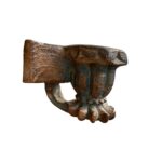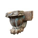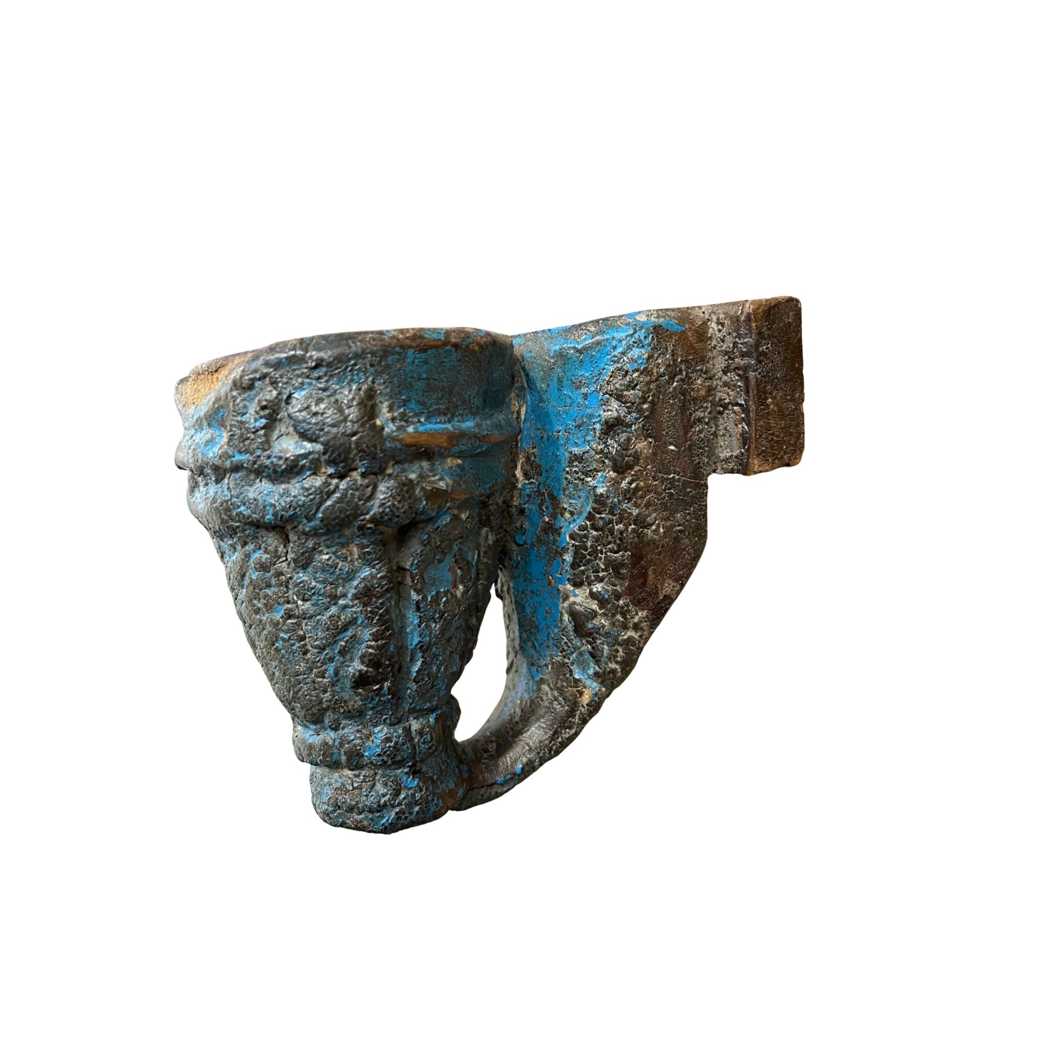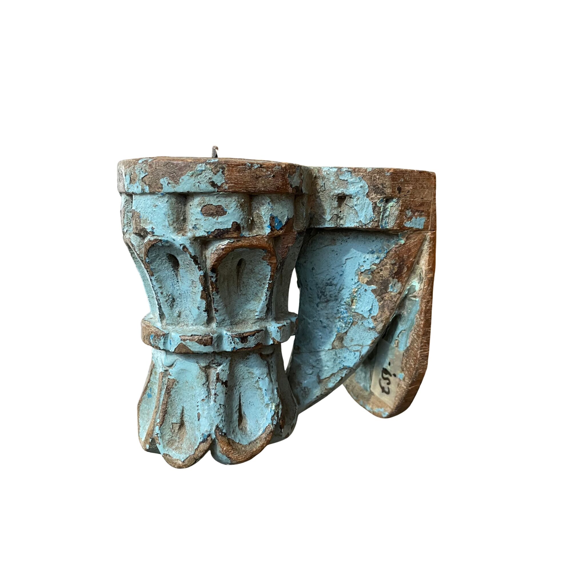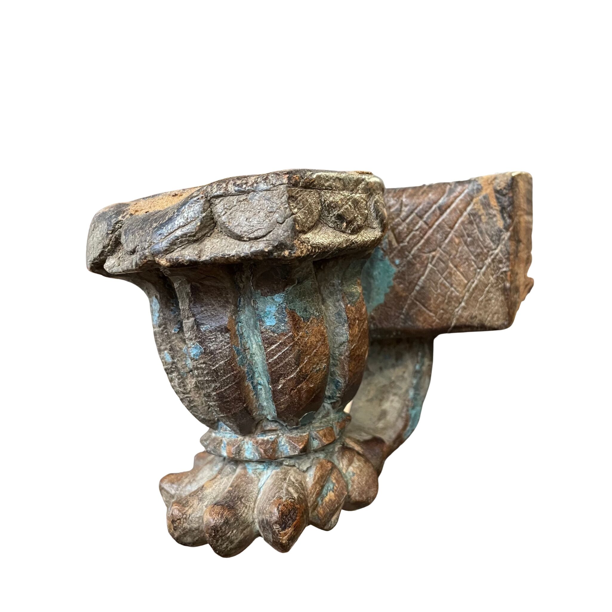 Diese besonderen Wandkerzenhalter bestehen aus alten architektonischen Elementen und geschnitzten Details mit starkem Ausdruck. Das massive Material, die markante Formensprache sowie die erhaltene, mehrschichtige Farbfassung verleihen jedem Stück eine charaktervolle, durch die Zeit geprägte Ausstrahlung.